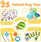 Super Luxury Puppy Toys for Teething Small Dogs: There are 25 pack of 8 various rope toys, 5 squeaky plush toys, 5 natural rubber toys, 1 treat ball, 5 dog bag rolls and 1 holder. Great size for small puppy and just pay less to get more than others Various Tough Rope Toys & Great for Interactivity: Designed tighter weaves with hundreds of fibers and made of natrual material to be more long-lasting and bite-resistant. Mostly, great for interactivity and enhance the relationship Plush Squeaky Toys & Treat Ball: Our plush toys with built-in squeaker can make sound to attract your pup's attention, is a great way to reduce the boring time. Besides, the treat ball can improve puppy's intellect by learning how to get treat fall out Protect Your Furniture & Clean Teeth: Dogs are natural chewers. These toys will keep puppies busy chewing from destroying your furniture. Plus, it is great for dental health that help puppies soothe gums and promote clean teeth Satisfaction Choice & Kindly Reminder: Our dog chew toys will be great for your puppy. Meanwhile, we suggest only use under supervision if your dog is extremely aggressive chewer, and not for large breed Product Description Zeaxuie Dog Chew Toys for Small Puppies to Get More Choices and Fun & Protect Your Home ! This is a great combination of various toys, great size for puppies and valued to get more choices and fun. Bring multiple benefits to your puppy and keep them from destroying the home items. Cute & Colorful Plush Squeaky Toys Various plush squeaky toys are cute and colorful. The built-in squeaker can attract pup's attention to chew and play the toys. Long-lasting & Fun Rope Toys Designed tighter weaves with hundreds of fibers to be more long-lasting for playing longer. It's great set of tug, chewing & shaking. Treat Ball & Natural Rubber Toys Made of premium quality natural material, the toys are safe, healthy and bite-resistant for your puppy to play. Great for your puppy. Bring Multiple Benefits to Your Puppy ! Your puppy play with our dog chew toys can get more benefits, such as clean teeth, ease boredom, avoid destructive chewing, etc. Keep Your Puppy Happy All The Time ! This super valued dog toys pack is nice for your puppy to get more happiness. NOTE: Not for Aggressive Chewers and Large Breed