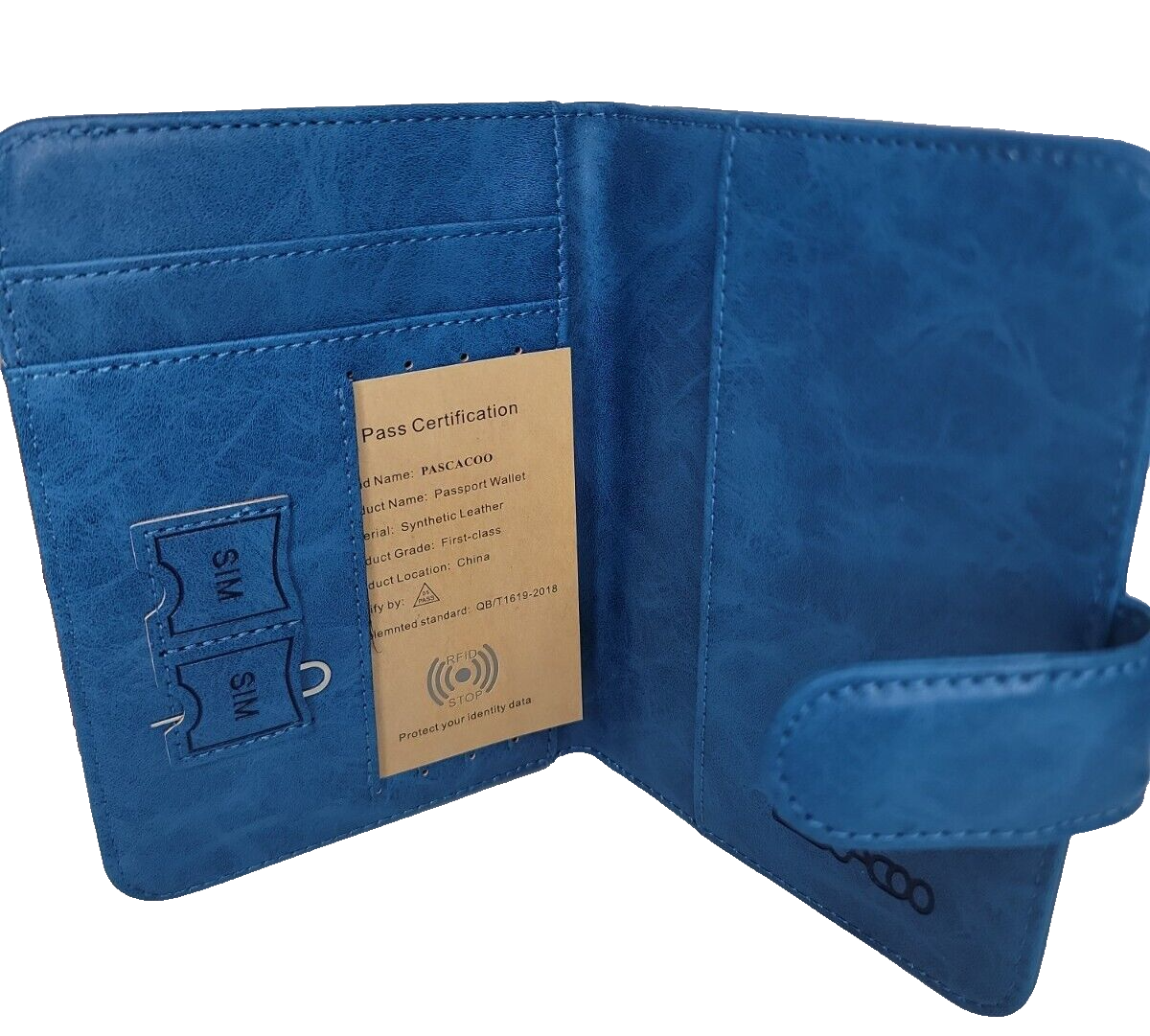 Pascacoo Passport Holder Case Card Organizer RFID Blocking - Blue Faux Leather.