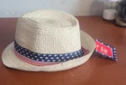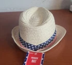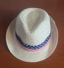 This Patriotic Fedora Youth Hat in great shape is designed for unisex kids, featuring a classic American theme with its straw material and beige color. The hat has a size of 6 x 7 inches, making it suitable for young wearers. Styled in a fashionable Fedora design, this accessory adds a touch of patriotism to any outfit, perfect for celebrating American pride or adding a fun twist to everyday wear.
