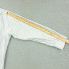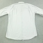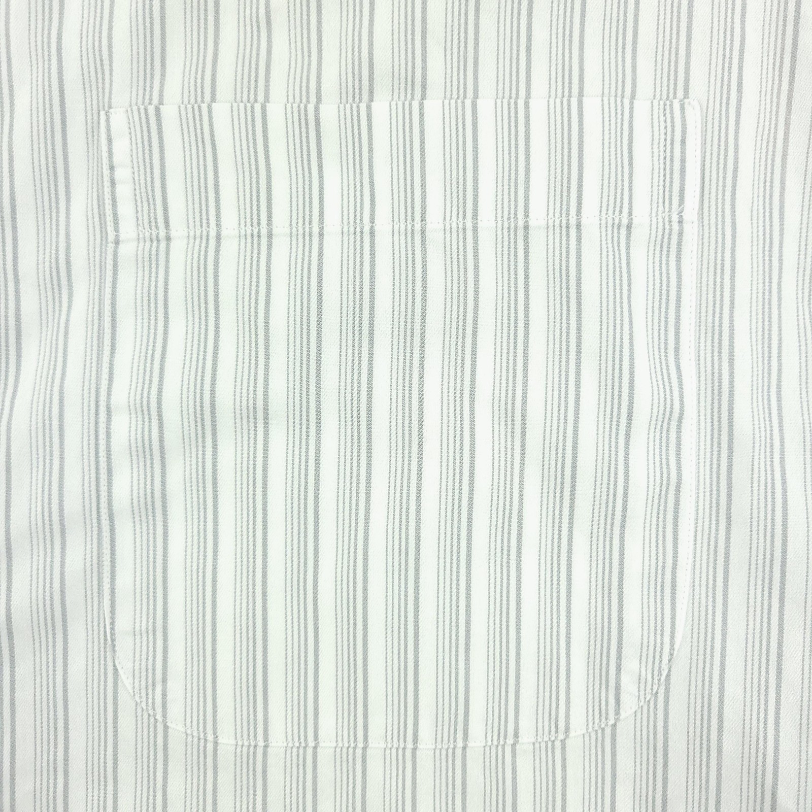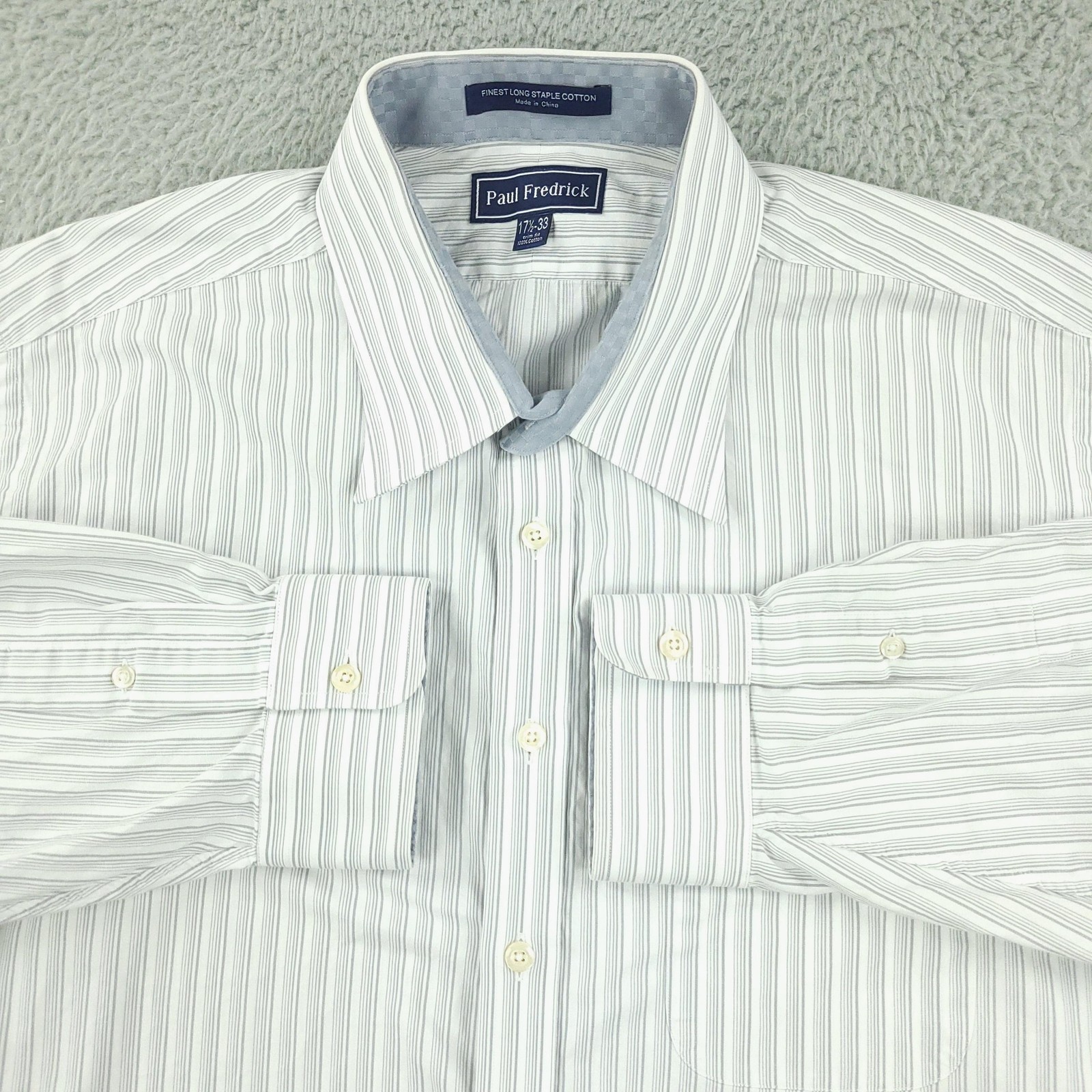 Brand: Paul Fredrick Style: Mens long-sleeve button-front dress shirt in a trim fit silhouette. Color: White base with light gray vertical stripes and light gray contrast inner collar and cuffs. Material: 100% cotton; labeled "Finest long staple cotton"; made in China. Size on tag: 17½-33 (neck 17.5, sleeve 33). Details: Point collar, single chest pocket, button barrel cuffs with contrast lining, curved shirttail hem, lightweight woven fabric ideal for office, business, or formal wear. Washed and dried with Fragrance Free Detergent & Dryer Sheets. Measurements are included in the photos, compare measurements with your item to ensure proper fit. (Measurements are done with the item lying flat). I ship next business day and all items include tracking. Items are added daily to my store Visit My Store Buy More & Save! Combined shipping for US customers - $1.99 for each additional item (Add items to shopping cart and discounts will automatically calculate during checkout)