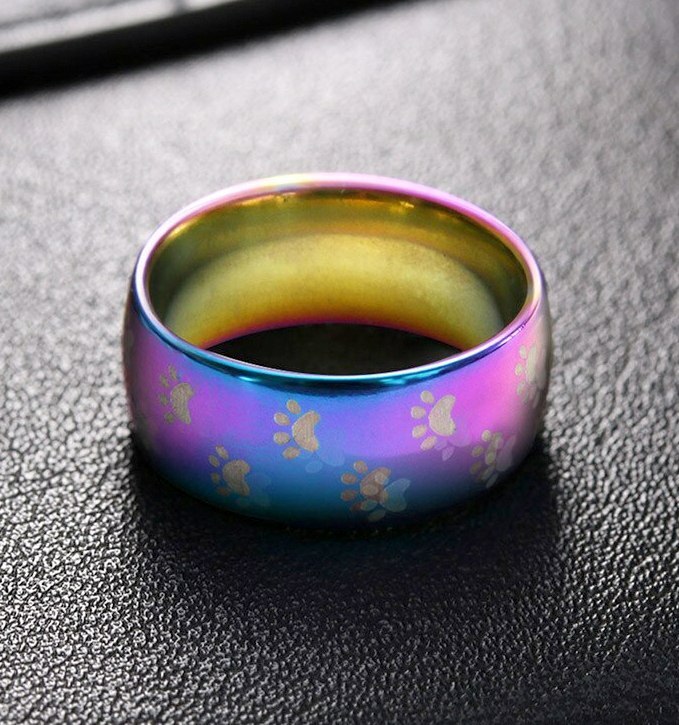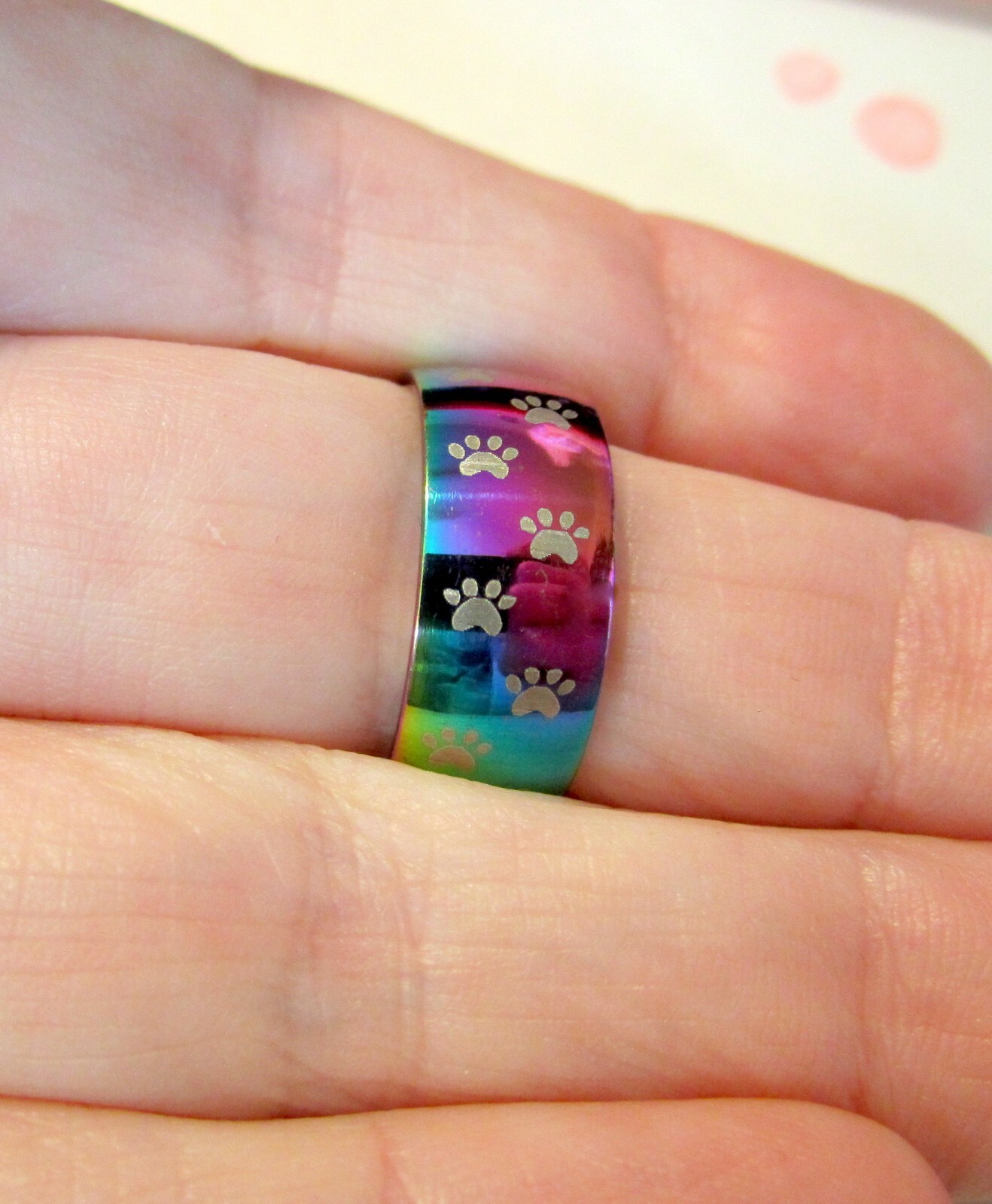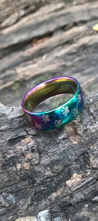 DETAILS This listing is for a beautiful rainbow colored steel paw print ring...size 7! The band measures approx. 8mm wide. These can be used for many purposes such as pet memorial, pet lover, wedding, promise, engagement and so on. It is very high in quality and super stunning!! This gorgeous ring would make the perfect gift!! FEEDBACK POLICY DUE TO A LARGE NUMBER OF BUYERS THAT NEVER RETURN FEEDBACK...I WILL ONLY GIVE IT AFTER THE BUYER DOES. WHEN THE BUYER RECEIVES THEIR ITEM AND LEAVES ME POSITIVE FEEDBACK, I PROMISE TO RETURN THE FEEDBACK TO THEM. SOMETIMES IT TAKES ME A FEW DAYS BUT I WILL GET IT TO YOU!! IF THE BUYER IS NOT HAPPY WITH SOMETHING I ASK THEM TO PLEASE CONTACT ME BEFORE LEAVING FEEDBACK AND GIVE ME THE FAIR CHANCE TO MAKE THINGS RIGHT!! I HOPE THAT MY BUYERS WILL UNDERSTAND AND I THANK YOU!! QUESTIONS Ask any question that you may have. If you are not happy with this item when you receive it.... please contact us instead of leaving a negative feedback. We are always willing to work anything out. Our customers come first and we want them to be happy. We always promise excellent customer service. A happy customer comes back!! We stand 100% behind our products and 100% guarantee all of them!! PAYMENT DETAILS USA and OUTSIDE USA: We accept PAYPAL payments. We do combine shipping on multiple items IF all items are paid within one payment. PLEASE WAIT FOR COMBINED SHIPPING INVOICE!! If you cannot pay with Paypal immediate, please let us know right away. This will keep us from bothering you with tons of invoices because we will know when to expect your payment!! Items MUST be paid for within 4 days. If not, We will relist the item and file a Non-Paying Bidder complaint. We truly hope that all transactions can be smooth and pleasant!! PLEASE understand that shipping is more than just stamps or postage. We do combine shipping on multiple items IF all items are paid within one payment. PLEASE WAIT FOR COMBINED SHIPPING INVOICE!! I try and ship items out within 24-48 hours after payment is received. I am very careful to package items extremely well which requires alot of high quality packing materials. Please also understand that no matter how fast I ship...the postal service is out of our control. Thank you! FOR RETURNS If you feel that you are not happy with an item, please CONTACT ME before leaving feedback. If the item is broken...I require return and will refund your payment in full when the item gets back to me. If you just dont want the item and choose a REFUND please understand that I cannot issue it until I have the item back in my home and it is in the EXACT shape as when it left. You will need to return the item at your own expense and refunds do not include shipping unless the item is broken or not as described. This is the only way that I can recover some of my costs that I would otherwise lose. THANK YOU!!