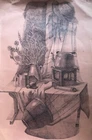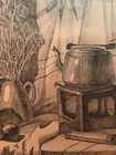 №AAA2263 This beautiful painting features an abstract still life with a kettle, bouquet, and hat. The muted colors and simple composition create a feeling of relaxation and serenity, making it the perfect addition to any home. Whether you're looking to add a touch of elegance to your living room or want to create a tranquil oasis in your bedroom, this painting is sure to do the trick. With its timeless subject matter and calming atmosphere, it's sure to be a favorite for years to come. *** ABOUT THIS PAINTING *** * TITLE: "Relaxation" * ARTISTS: Unknown artist * SIZE: 42x61 cm/'16.53x24.01 inches' * MEDIUM: pencils, paper * HAND PAINTED: Original painting from our collection * CONDITION: we tried to convey the maximum information with the help of photos about this product