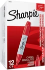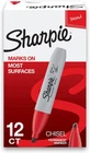 Proudly permanent ink marks on paper, plastic, metal, and most other surfaces Intensely brilliant colors create eye-popping, vibrant impressions Remarkably resilient ink dries quickly and resists fading and water; AP certified Endlessly versatile chisel tip is perfect for countless uses in the classroom, office, home, and beyond Includes 12 Red Sharpie permanent markers The permanent marker with a split personality, Sharpie Chisel Tip Permanent Markers have a versatile tip that makes both broad and fine strokes--so you can express yourself any way you want. Bold to the max and permanent to the core, Sharpie Permanent Markers inspire you to transform ordinary surfaces into passionately creative statements. Made to write practically everywhere, vivid Sharpie markers eliminate dull and boring. Sharpie has iconic ink that dries quickly and resists both water and fading. While pale imitations wither away, Sharpie markers make creations that endure.