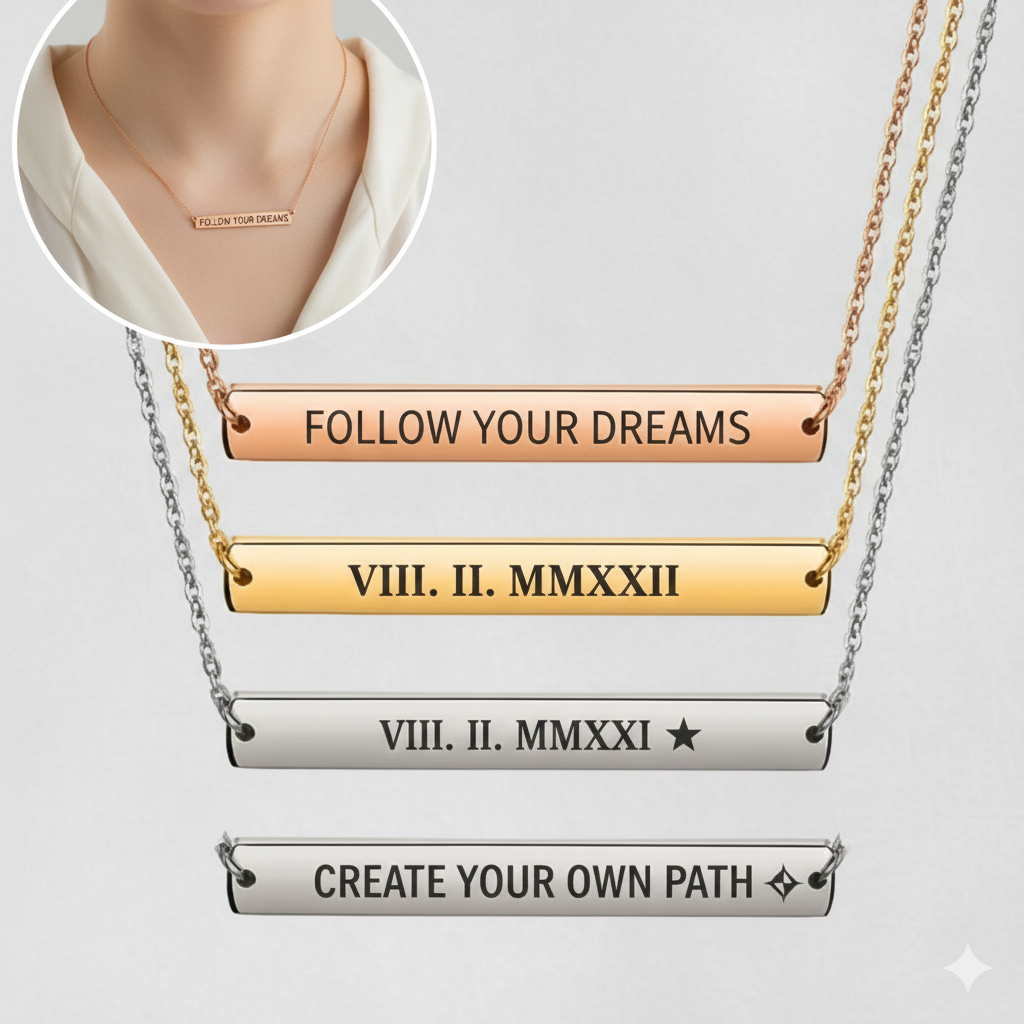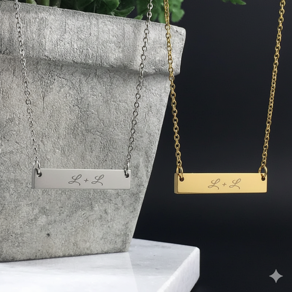 Personalized Horizontal Bar Necklace – Custom Engraved Bar Pendant Small pendant = limited engraving space. Long messages are not suitable. Text Length Limit (IMPORTANT) Due to the size of the pendant (approximately 2–4 cm), engraving space is limited. Maximum engraving length is up to 20–25 characters per line, depending on font choice. Longer text will be automatically resized, condensed, or adjusted to fit the pendant. We do not engrave long messages, paragraphs, or multiple sentences on small pendants. If text exceeds what is suitable for the pendant size, we may shorten, resize, or cancel the order if no suitable layout is possible Bullets points Our 2-Sided Bar can be personalized with a date, birth information, name, coordinates, word or phrase on up to 2 sides engraved. • Engravings can be on each of 2 sides • Minimalist, sleek bar design • Bar Size: 40mm x 10mm • Chain length: 60cm • Free box Packing IMPORTANT: Please double-check your text before ordering. Personalised items are engraved exactly as provided and cannot be changed once processed. Personalised Engraved Pendant – Custom Name & Date Create a meaningful keepsake with our custom engraved pendant, professionally engraved using the exact text and font you select at checkout. Each item is made to order and personalised specifically for you. Product Details Material: Stainless Steel Finish: Polished Pendant Type: Engraved jewellery pendant Engraving: Precision laser engraving Chain: Included (where applicable) Personalisation Information (PLEASE READ) You will be asked to select a font style and enter your text/date at checkout. Engraving size, spacing, and proportions are automatically scaled to fit the pendant surface and selected text. Exact engraving dimensions are not fixed and are not customisable unless explicitly requested before purchase. If you require specific sizing, spacing, or layout, you must message us before ordering. Listing Images Images are for illustration purposes only. Photos show font styles and engraving examples, not guaranteed text size or scale. Actual engraving appearance may vary slightly depending on text length, font choice, and pendant shape. Returns & Refunds This is a custom-made, personalised item. Returns or refunds are not accepted unless the item is faulty or engraved incorrectly compared to the text provided. Returns based on personal preference, appearance expectations, or size perception cannot be accepted. Quality Assurance Each pendant is engraved carefully and inspected before dispatch to ensure it matches the personalisation details submitted with your order