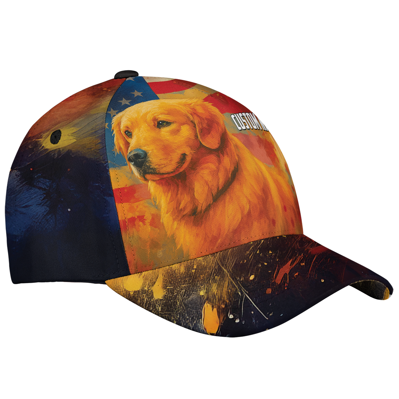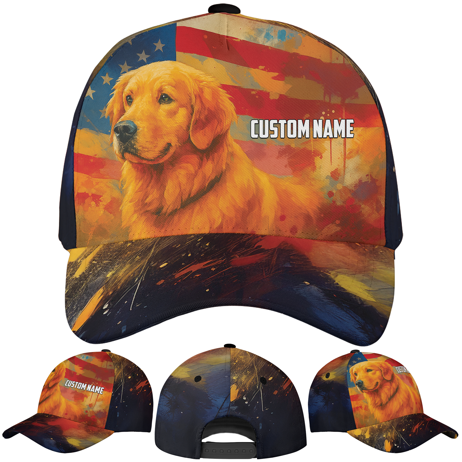 Golden retriever hat, patriotic dog cap, dog lover gift, custom dog cap, america flag hat, dog dad baseball cap, personalized dog lover, us dog hat, golden retriever cap, 4th of july dog hat, pet owner gift, custom dog breed cap, dog mom gift, animal print cap, dog themed cap, summer pet hat, cute dog hat, personalized pet gift, independence day hat, flag dog cap * Product details : A custom all over print baseball cap can be a bold accessory for your outfit. It is not only fashionable but also comfortable to wear, even under the scorching sun. Structured 5-panel mid-profile baseball cap with a seamless front, plastic snap closure on the back for a custom fit, a soft sweatband inside for extra comfy, and a sturdy plastic pre-curved visor. Light-weight polyester fabric is suitable to keep the head cool even under hot weather. A hard buckram is added to the front panel, creating forms and helping to hold its shape under the harshest condition. Eyelets are reinforced and stitched in four panels (except for the front) for better ventilation. It also gets a fabric-covered top button. Our custom hat is packaged properly, so it can maintain the perfect shape at all times and offer a classic look to you. One size fits most. Our baseball cat goes well with sporty outfits and casual wear. You can wear the caps on a daily basis when going outside. Even when you stay indoors, it can still enhance your styles and add accents to your outfits. Gift it to your friends, yor dads, and your beloved ones who love sporty looks. * Size chart: * Processing and handling time: This is Print on Demand (PoD) product, it will take 1 – 5 working days for production. Items which have QC problems may need more time for production. * Shipping/ Transit time: Domestic order is expected to deliver within 5-10 business days. International order is expected to arrive within 7-15 working days. * Cancellation: We can only accept the cancellation if item is still in processing stage. We have no way to hold item once it is in production stage. Normally items will be moved to production 1 day after purchasing. * Refund/ replacement/ return policy: Please contact us within 30 days after receiving item for any question. Basically, we are not able to offer refund/ return/ replacement due to wrong selection of color, size, changing mind, second thought. Thank you for shopping with us! Listing and template services provided by inkFrog