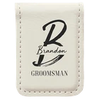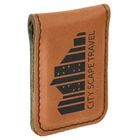 Money clip has magnetic "closure". Leatherette offers the look and feel of genuine leather at a fraction of the price. This richly textured, synthetic material resists water spots, cleans easily, and is durable enough for the rigors of daily use. The high quality workmanship of each leatherette piece is sure to impress every recipient with its elegant individuality. leatherette items can be personalized through laser engraving for a sharp contrast or direct printing for a full color effect.