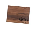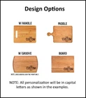 Design: Personalized Pantry Cutting Board or Charcuterie Serving Tray All items ship via USPS - please make sure your address is correct :-) Whether used as a charcuterie serving tray for snacks or cutting board, our bamboo, walnut and cherry custom boards are the perfect addition for the home and make the perfect gift for your loved one celebrating a birthday, anniversary, new home, wedding, etc! *** FEATURES *** • SIZES: We have multiple styles and sizes available. To see our current sizes available, click the drop-down menu. The photo slide contains a photo showing each side by side. Please note, the board with the juice groove only has the groove on the front side of the board. • THICKNESS: Bamboo Boards - Approximately 1/2" Thick; Walnut & Cherry Boards - Approximately 3/4” Thick • UNIQUE: Every board is unique with the grain and coloring varying throughout - no board is the same! • CARE INSTRUCTIONS: Hand wash only with warm water. Do not soak. Please apply mineral oil throughout the board’s life. • PERSONALIZATION/CUSTIMIZATION: Do you want the text placed differently on the board? Please don’t hesitate to contact us. All personalization notes can be entered in the personalization box when checking out. • SHIPPING: All cutting boards ship within 2 to 5 business days. • WHOLESALE ORDERS: Please don’t hesitate to contact us for information about wholesale orders. Processing times for larger orders may change. • NOTE: Colors can vary a bit on different monitors and screens. Any props included in photos are not included. Please be sure to double-check your address to make sure it is accurate for USPS delivery. If a package is returned to us due to an invalid address, the buyer is responsible for all additional shipping charges. We appreciate you supporting small business – best wishes! For items ordered with simple edits, we do not send proofs since the layout doesn't change from the example(s). However, in the event there are requests that change the layout from the example(s), we do send proofs for approval before making the product. If you'd like a proof before we make the product, please note so in the personalization box.