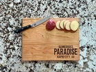 Design: Personalized Paradise Cutting Board or Charcuterie Serving Tray All items ship via USPS - please make sure your address is correct :-) Whether used as a charcuterie serving tray for snacks or cutting board, our bamboo, walnut and cherry custom boards are the perfect addition for the home and make the perfect gift for your loved one celebrating a birthday, anniversary, new home, wedding, etc! *** FEATURES *** • SIZES: We have multiple styles and sizes available. To see our current sizes available, click the drop-down menu. The photo slide contains a photo showing each side by side. Please note, the board with the juice groove only has the groove on the front side of the board. • THICKNESS: Bamboo Boards - Approximately 1/2" Thick; Walnut & Cherry Boards - Approximately 3/4” Thick • UNIQUE: Every board is unique with the grain and coloring varying throughout - no board is the same! • CARE INSTRUCTIONS: Hand wash only with warm water. Do not soak. Please apply mineral oil throughout the board’s life. • PERSONALIZATION/CUSTIMIZATION: Do you want the text placed differently on the board? Please don’t hesitate to contact us. All personalization notes can be entered in the personalization box when checking out. • SHIPPING: All cutting boards ship within 2 to 5 business days. • WHOLESALE ORDERS: Please don’t hesitate to contact us for information about wholesale orders. Processing times for larger orders may change. • NOTE: Colors can vary a bit on different monitors and screens. Any props included in photos are not included. Please be sure to double-check your address to make sure it is accurate for USPS delivery. If a package is returned to us due to an invalid address, the buyer is responsible for all additional shipping charges. We appreciate you supporting small business – best wishes! For items ordered with simple edits, we do not send proofs since the layout doesn't change from the example(s). However, in the event there are requests that change the layout from the example(s), we do send proofs for approval before making the product. If you'd like a proof before we make the product, please note so in the personalization box.