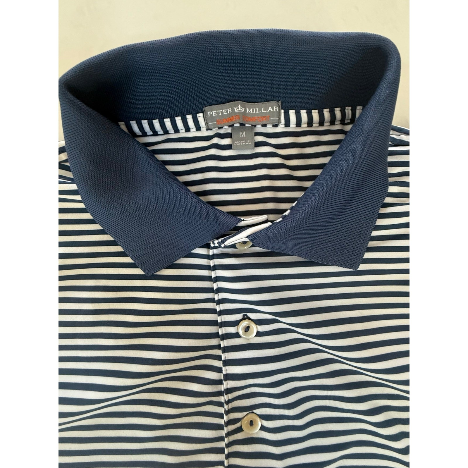 Peter Millar Summer Comfort Golf Polo Blue White Stripe Performance Shirt Size M Excellent pre-owned condition. Logo on left sleeve. Fast shipping. I'm happy to answer any questions! golf, walking, performance shirt, blue and white stripe, lightweight, breathable