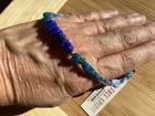 Beautiful shades of blue gemstone bracelet by Peyote Bird Designs. Handmade in Santa Fe New Mexico. Stones are dark blue lapis, blue green apatite and shiny blue kyanite. Measures 7 inches long, excluding hook. Closure is Sterling Silver hook that goes into leather loop. Nicely done! Ships USPS Ground Advantage.