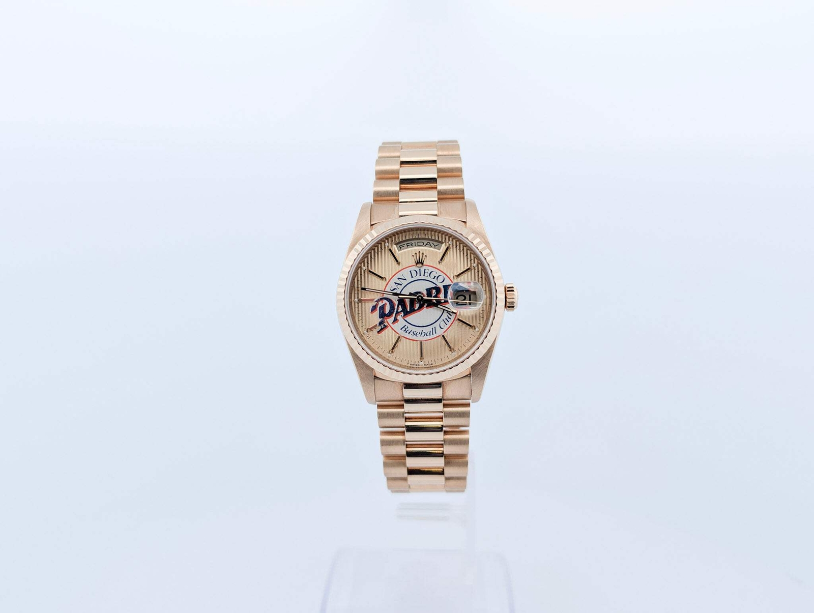 Phil Nevin Rolex Day-Date 18238 Padres Signed Dial Box Watch Sports Memorabilia The Rolex Day-Date 18238 from 1999 is a timeless symbol of prestige, crafted in 18k yellow gold and featuring the iconic President bracelet. However, this particular example stands out as a truly unique collector’s piece, likely gifted as part of Phil Nevin’s signing bonus during his time with the San Diego Padres. What makes this watch especially rare is its custom dial, stamped with the Padres logo, a striking personalization that blends luxury with baseball history. The champagne dial—a classic hallmark of the Day-Date—offers an elegant contrast to the bold team emblem. Inside, the watch houses the Caliber 3155 movement, ensuring precision timekeeping with day and date functionality. Adding to its significance, the caseback is engraved with Phil Nevin’s name, marking it as a likely commemorative gift celebrating his arrival in San Diego. Rolex watches customized for athletes and executives are seldom seen on the open market, making this a one-of-a-kind timepiece for both Rolex collectors and Padres fans alike. Phil Nevin: Power Hitter Turned ManagerBest known for his time as a power-hitting third baseman and first baseman, Phil Nevin has remained deeply involved in baseball as a coach and manager. Drafted first overall in the 1992 MLB Draft by the Houston Astros, he initially struggled to find his footing in the majors before breaking out with the San Diego Padres, where he enjoyed the best years of his career. Nevin joined the Padres in 1999 and quickly became a key contributor, establishing himself as one of the team’s top offensive players. His peak came in 2001, when he belted 41 home runs, drove in 126 RBIs, and hit .306, earning his lone All-Star selection. A consistent slugger through the early 2000s, he wrapped up his Padres tenure with 156 home runs, earning a reputation as a fierce competitor. After retiring, Nevin transitioned into coaching, eventually managing the Los Angeles Angels from 2022 to 2023. Condition Report: Watch features outter box, and wood rolex box both with signs of wear. The watch is in overall very good condition with light signs of wear on the case and bracelet. Phil Nevin Rolex Day-Date 18238 Padres Signed Dial Box Watch Sports Memorabilia The Rolex Day-Date 18238 from 1999 is a timeless symbol of prestige, crafted in 18k yellow gold and featuring the iconic President bracelet. However, this particular example stands out as a truly unique collector’s piece, likely gifted as part of Phil Nevin’s signing bonus during his time with the San Diego Padres. —a classic hallmark of the Day-Date—offers an elegant contrast to the bold team emblem. Inside, the watch houses the Caliber 3155 movement, ensuring precision timekeeping with day and date functionality. Adding to its significance, the caseback is engraved with Phil Nevin’s name, marking it as a likely commemorative gift celebrating his arrival in San Diego. Rolex watches customized for athletes and executives are seldom seen on the open market, making this a one-of-a-kind timepiece for both Rolex collectors and Padres fans alike. Phil Nevin: Power Hitter Turned Manager Best known for his time as a power-hitting third baseman and first baseman, Phil Nevin has remained deeply involved in baseball as a coach and manager. Drafted first overall in the 1992 MLB Draft by the Houston Astros, he initially struggled to find his footing in the majors before breaking out with the San Diego Padres, where he enjoyed the best years of his career. Nevin joined the Padres in 1999 and quickly became a key contributor, establishing himself as one of the team’s top offensive players. His peak came in 2001, when he belted 41 home runs, drove in 126 RBIs, and hit .306, earning his lone All-Star selection. A consistent slugger through the early 2000s, he wrapped up his Padres tenure with 156 home runs, earning a reputation as a fierce competitor. After retiring, Nevin transitioned into coaching, eventually managing the Los Angeles Angels from 2022 to 2023. Condition Report: Watch features outter box, and wood rolex box both with signs of wear. The watch is in overall very good condition with light signs of wear on the case and bracelet. × × × × × × × × × × Buy now and save! Shipping info Click the Shipping & Payments tab above the listing description for more info Click the Shipping & Payments tab above the listing description for more info! Additional delivery notes PICK UP OPTION Sorry, our items are NOT available for pick-up. PAYMENT Immediate payment is required upon selecting "Buy It Now" or upon checking out through the cart. We accept payment via U.S. PayPal accounts and all Major Credit Cards, Debit Cards & Google Pay. We are legally required to collect sales tax in those states and localities where we maintain a physical presence (nexus). The applicable amount of sales tax charged to an order will be calculated based on the shipment destination's state and local sales tax laws. Thank you for shopping with us on eBay! Additional Information No additional information at this time Ask seller a question You might also like Rolex Datejust 31 Chocolate Diamond Dial Box & Paper Jubilee 278271 Watch Audemars Piguet Royal Oak Offshore Box & Papers 26283ST Black Dial Steel Watch Rolex OP 31 UAE Armed Forces signed Oyster Perpetual Box&Papers Pink markers Rolex Datejust 36mm Rare Arabic Motif Dial Two Tone Ref: 16013 Jubilee Bracelet Contact To contact our Customer Service Team, simply click the button here and our Customer Service team will be happy to assist. Ask seller a question © Watch Them Tick Shipping & Payments Click the Shipping & Payments tab above the listing description for more info Payment Accepted Payment Methods Immediate payment is required upon selecting "Buy It Now" or upon checking out through the cart. We accept payment via U.S. PayPal accounts and all Major Credit Cards, Debit Cards & Google Pa