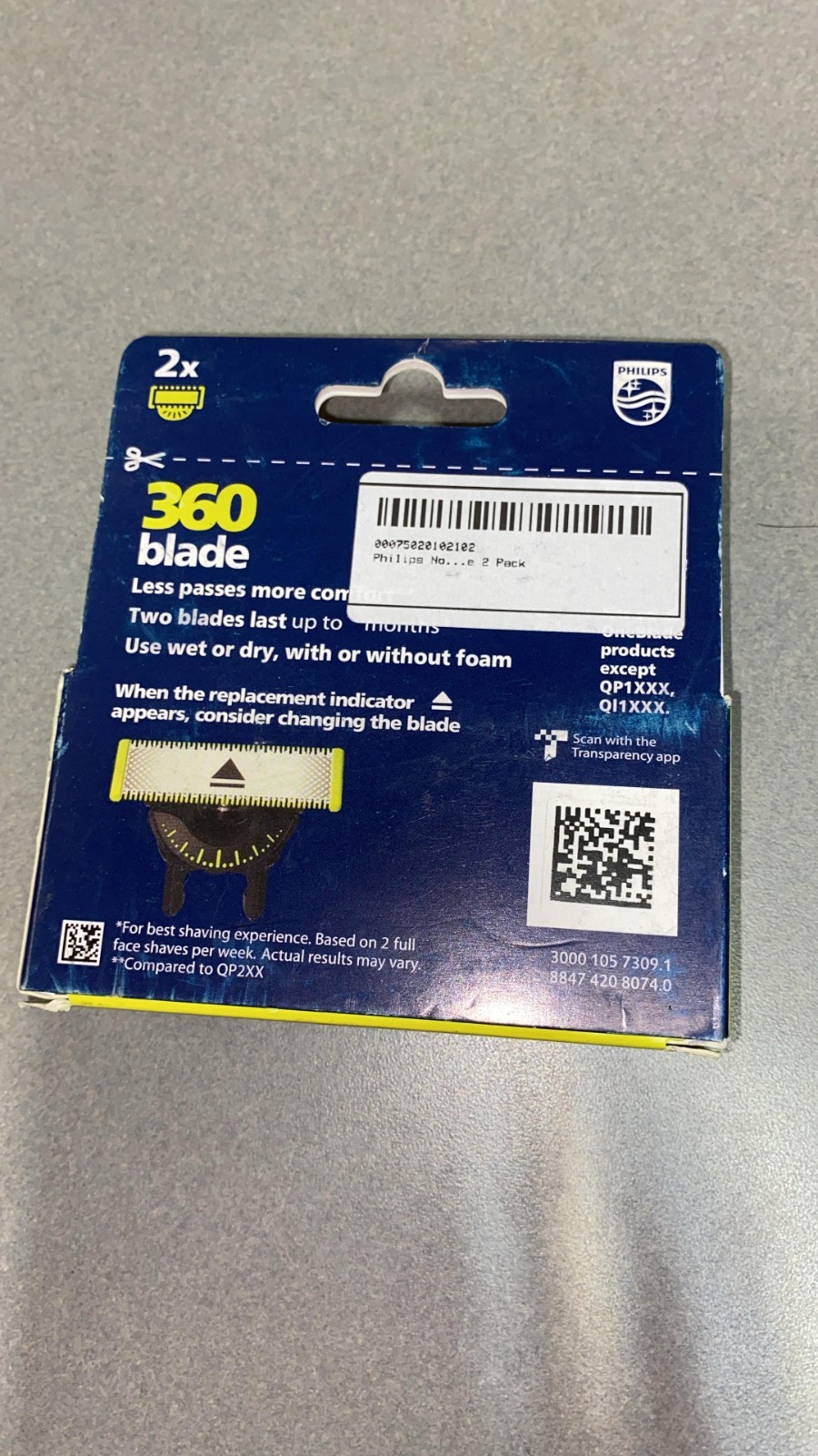 Philips Norelco OneBlade 360 Replacement Blade β’ 2 Pack β’ Precision Shaving Keep your grooming routine sharp with the Philips Norelco OneBlade 360 Replacement Blades (2 Pack) . Designed to flex in all directions, the 360 blade follows facial contours for a comfortable, close shave. πΉ Key Features β 360Β° rotating blade for better contact and control β Designed for face and body grooming β Long-lasting stainless steel blades β Compatible with Philips OneBlade & OneBlade Pro π¦ Product Details Brand Philips Norelco Product Type Replacement Blades Model OneBlade 360 Quantity 2 Blades Condition New π Dimensions & Weight Package Dimensions Approx. 4.33 Γ 3.94 Γ 0.87 inches Net Weight (Blades) Approx. 0.35 oz (10 g) Shipping Weight Approx. 0.88 oz (25 g) β Why Choose OneBlade 360? The innovative 360 blade adapts to your facial contours, helping reduce missed hairs and skin irritation. Perfect for trimming, edging, and shaving with one versatile tool. β 100% Genuine Philips Product β Fast & Secure Shipping