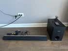 Used. Everything works excellent. Some scuffs and scratches as pictured but nothing severe. Includes as pictured: -Sound Bar Unit -Subwoofer -Remote w/ New CR 3025 Battery -Power Cable -Aux Cable -Optical Audio Gold Sound Cable Any questions or concerns please ask as all sales are final once complete. Technical Specifications Sound Sound Enhancement DoubleBass FullSound Night Mode Treble and Bass Control Subwoofer output power 30 W Speaker output power 15 W x 2 Total Power RMS @ 30% THD 60 W Loudspeakers Loudspeaker types Integrated with main unit Subwoofer freq range 20 - 150 Hz Subwoofer driver 1 x 6.5" woofer Subwoofer type Passive Subwoofer impedance 8 ohm Speaker Drivers per side 1 x 5" woofer 1 x 1.5" Mylar tweeter Speaker Impedance 4 ohm Connectivity Front / Side connections Music iLINK Rear Connections AUX IN 1 Digital coaxial in* Digital optical in Subwoofer out Power Power consumption 20 W Power supply 110V 50/60 Hz Standby power consumption 0.21 W Dimensions Main Unit (W x H x D) 708 x 47 x 65 mm Weight incl. Packaging 5.4 kg Main Unit Weight 1.03 kg Packaging (W x H x D) 756 x 395 x 220 mm Subwoofer (W x H x D) 165 x 295 x 240 mm Subwoofer Weight 2.6 kg Subwoofer cable length 3.3 m