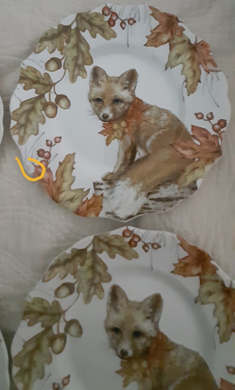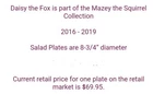 PREOWNED PIER 1 IMPORTS DAISY THE FOX LUNCHEON PLATES SET OF 4 ONE HAS CHIP - PLEASE VIEW ALL PHOTOS AS THEY ARE AN IMPORTANT PART OF THE DESCRIPTION CREDIT HAS BEEN GIVEN IN PRICE FOR THE ONE PLATE WITH CHIP INDONESIA FUN AND WHIMSICAL