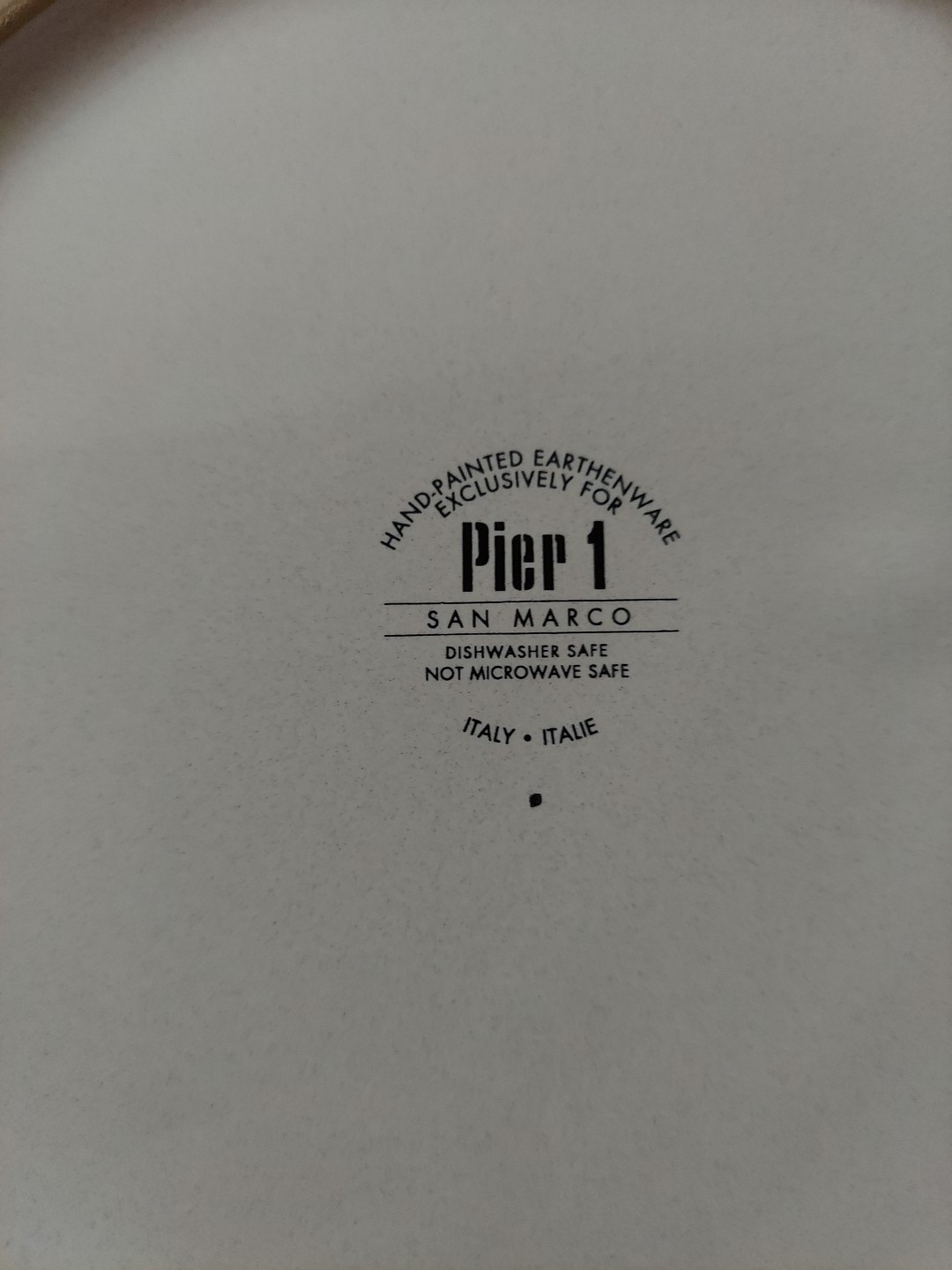 Production Technique:PotteryFeatures:Hand PaintedHandmade:YesType:Dinner PlateBackstamp:PrintedMaterial:CeramicTime Period Manufactured:2000-2009Vintage:NoProduction Style:Art PotteryAntique:NoShape:RoundColor:MulticolorManufacturer:Pier 1Set Includes:Dinner PlatePlate Diameter:11 3/8”Occasion:All OccasionsPattern:San MarcoEra:21st Century (2000-now)Piece:Dinner PlateBrand:Pier 1Finish:GlossyCountry of Origin:ItalyNumber of Items in Set:1Product Line:Saan MarcoSize:11 1/2 inchesOriginal/Licensed Reproduction:Original