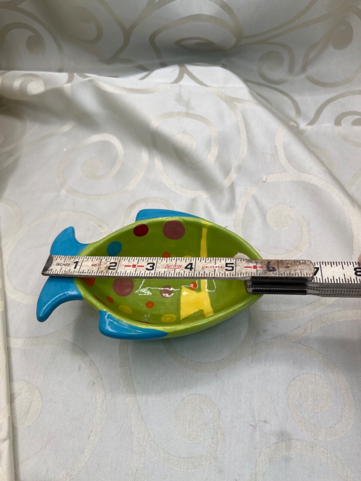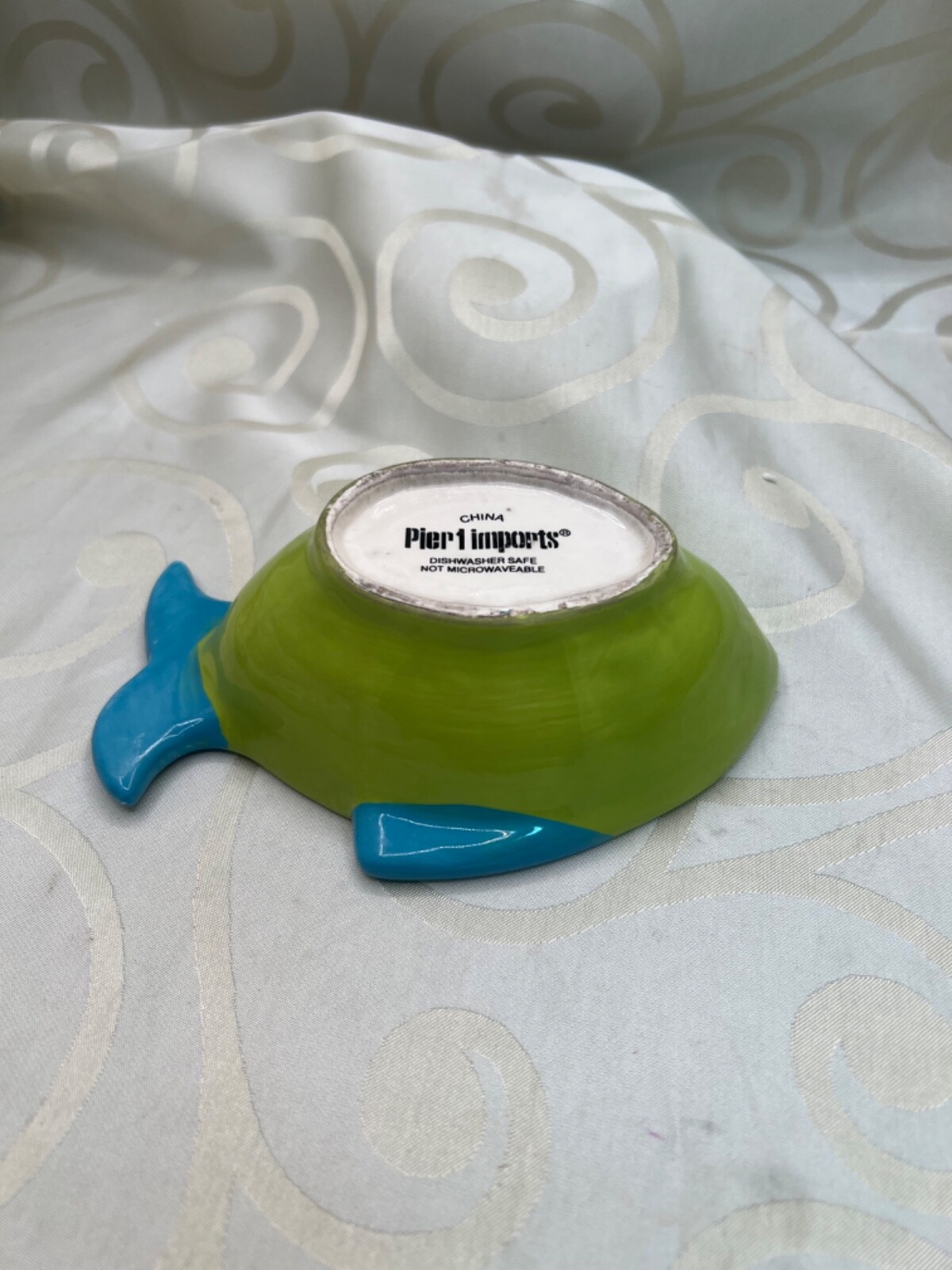 This is a Pier 1 Imports ceramic bowl featuring a green polka dot design with a fish theme. It is suitable for all occasions and can be used for serving sauces or dips. The bowl is crafted using art pottery techniques in China.