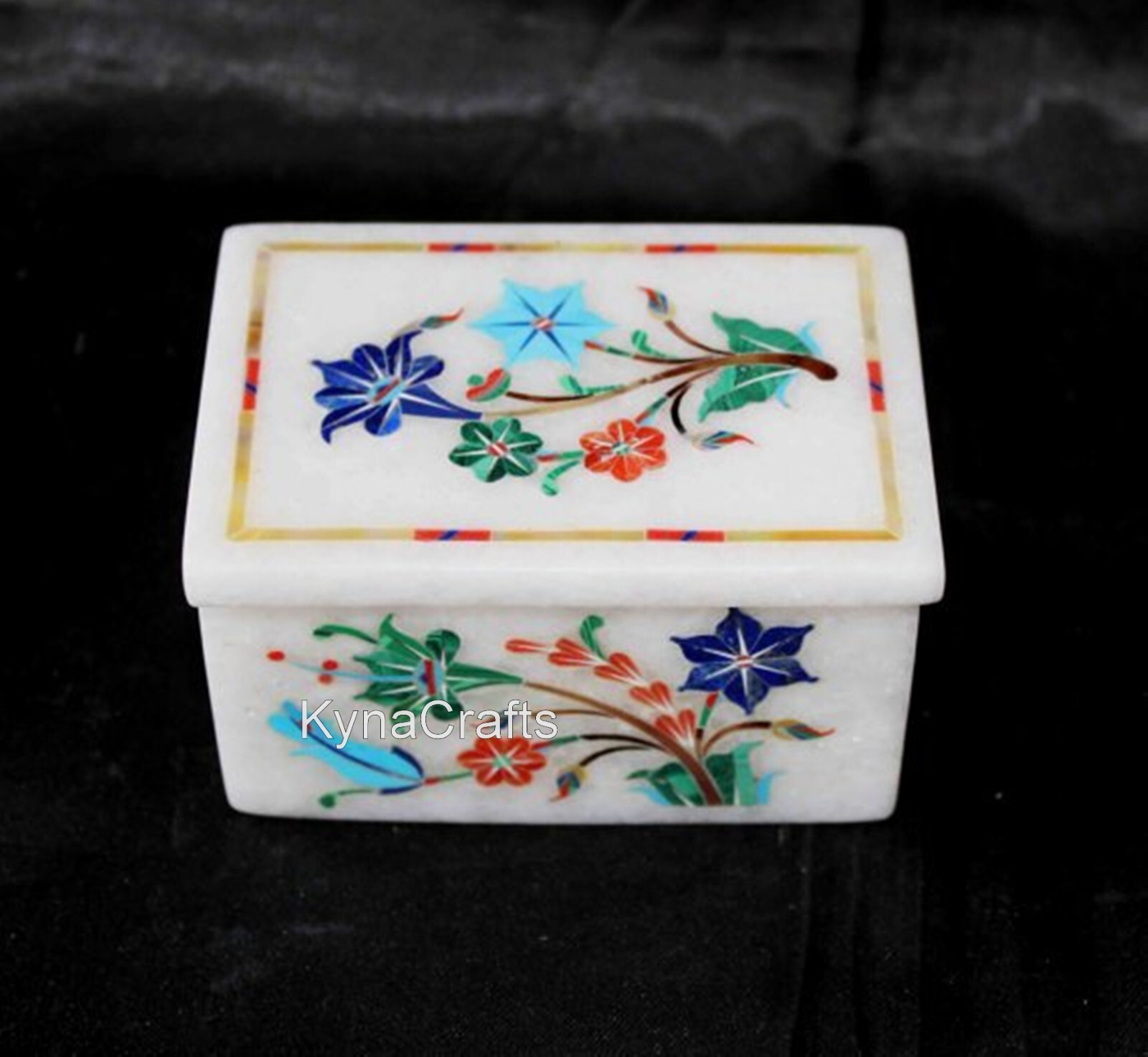 · This elegant and luxurious marble box is a great choice for storing your watches, rings, earrings, ear studs, necklaces, bracelets, cuff links, and brooches etc. · Handcrafted in India with Ancient Inlay Art, by the Skilled Artisans who are descendants of those families who built the Taj Mahal. · It is the perfect gift for your loved one i.e. mother, girlfriend, wife, daughter, colleague, or friend, a good choice as Birthday, Christmas , Wedding day, Valentine's Day, Mother's day, Anniversary Day Gift. · Adds high-style to yours dressing table & wardrobe. · Process of Inlay Art “Inlay work” is one of the most attractive art that done from marble. Same type of that adorns the Taj-Mahal and other Mughal monuments. It is a closely protected traditional art and only a few expert exponents are available today. The delicate process involves cutting and engraving marble shapes manually. To start with, a predefined pattern e.g., floral design or geometrical design is engraved on the marble slab. Small pieces of marble of different shades are cut delicately to fit in these grooves precisely. These small pieces are then slipped in the grooves. There are many varieties of colored stone available for utilization in marble inlay work: malachite, carnelian, jasper, mother of pearl, abalone shell, lapis lazuli, agate, coral, turquoise and tiger eye to name just a few. The grooves are filled with their precisely corresponding shapes of colored stone and secured in place with a white putty made from oil, and wax. Once the design is completely dry, the piece is polished with a mixture of sand, water and emery paper to give a shiny smooth finish. Apart from marble, many other materials can also be used. If You Are Looking Something Customize, Let Us Know We Will Make For You As Per Your Design, Size & Shape. Buyer has to pay Custom Duty or other taxes if any applicable in destination country. No two pieces are exactly alike, as the Gem Stones used have different Color, Pattern & Textures.