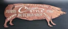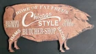 Vintage style pig bacon butcher shop metal farmhouse style sign. 18"W x 9.5"L. Two hooks on back for hanging. Some minor wear but overall great condition.