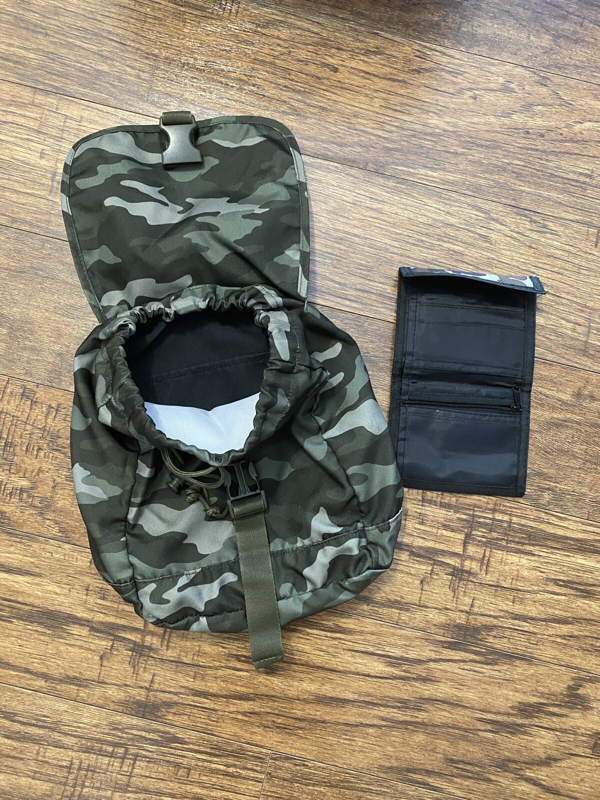 Backpack Pink. Military camouflage print, with unbranded matching wallet 9”x7”x3,5” Excellent condition!