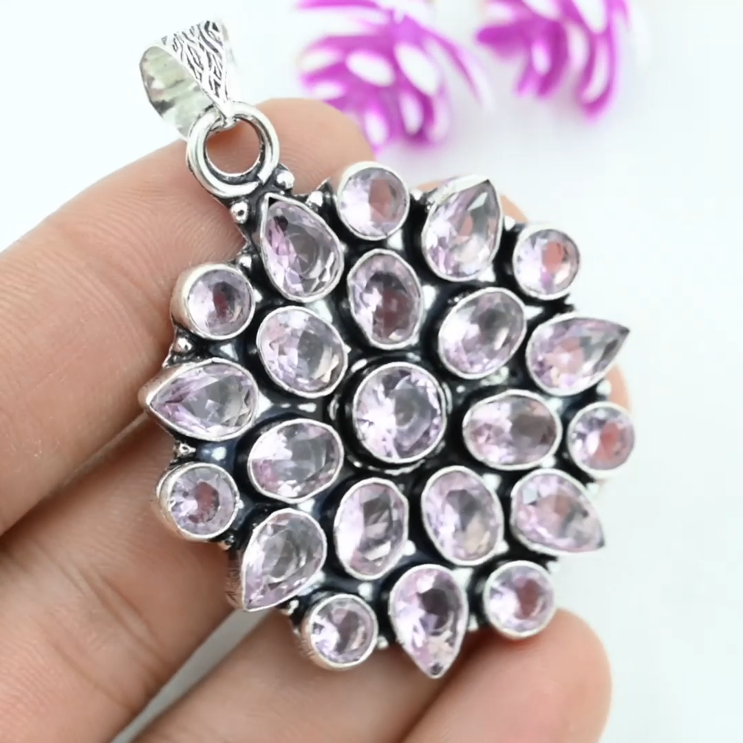 Style:PendantMaterial:GemstoneBase Metal:Sterling SilverPendant/Locket Type:Same As PictureMaterials sourced from:IndiaMain Stone Treatment:Not EnhancedDiamond Color Grade:N/ANumber of Diamonds:N/ACut Grade:N/ACountry of Origin:IndiaMain Stone:KunziteColor:SilverNumber of Gemstones:22Setting Style:Same As PictureDiamond Clarity Grade:N/AFeatures:HandmadeNecklace Length:2.36 InchesCertification:N/ACollection:HandmadeTotal Carat Weight:10 carat and aboveOccasion:Anniversary, Birthday, Christening, Christmas, Engagement, Father's Day, Mother's Day, Valentine's Day, WeddingTheme:Beauty, Bohemian, Ethnic, Halloween, Love, NatureType:PendantMain Stone Color:PinkChain Type:N/APendant Shape:Same As PictureClosure:Same As PictureBrand:HandmadeColored Diamond Intensity:N/AMetal:Sterling SilverMain Stone Creation:Lab-CreatedMetal Purity:925Secondary Stone:N/AMain Stone Shape:Same As Picture