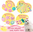 Pink Dog Toys for Female Puppy: Great for female dogs (under 25 Lbs), including 8 rope toys, 5 squeaky plush toys, 4 rubber chew toys, 1 treat ball, 4 dog bag rolls and 1 dispenser. Cute pink design creates princess-like happiness for your puppy Versatile & Multiple Interaction: Our various toys set can provide a richer way of interaction. The treat ball can exercise dog's intellect, the rope toys can be used for tug-of-war and fetching, while the squeaky plush toys attract the dog's interest Healthy Teething & Deep Cleaning: By giving your teething dog a variety of toys in different shapes, these toys can massage the gums from multiple angles. It helps to alleviate pain and anxiety, promote healthy teething and keep deep cleaning Good-quality Material: The chew toys are made of natural rubber, which are long-lasting and soft, will not cause damage to the dog's gums. Plus, the plush toys and ropes are made from premium material, so they are safe and can protect your dog's health Warm Tip for Dog Toy Set: Multifunctional and fun, these toys will be great for your dog and bring her happiness. Meanwhile, this set is suitable for puppy or small breed, not for aggressive heavy chewers Product Description Cute Pink Puppy Toys Bring Her Princess-like Happiness If you have a female puppy, this value set of toys will bring her princess-like happiness. Cute pink design and various functions, she will get endless fun and different benefits! Tough Rope Toys Made from premium material, our rope toys are tightly woven and not easy to loose. Suitable for tug for war, swinging, etc. Cute Plush Squeaky Toys The cute plush toys provide your puppy with various surprises, while the inner squeakers or crinkle paper will attract her interest. Soft Rubber Chew Toys Made of soft natural rubber, the chew toys with different design bring her various benefits, such as clean teeth, improve intellect. Our dog toys with multiple functions will solve your various troubles and make you enjoy the happy time with her. With the bumpy texture, our rubber chew toys can fully massage her gums and clean her teeth, effectively helping teething. We are committed to providing high-quality products, and these toys are made of natural materials, which will be safe for her. Great size for puppy or small breed ( under 25Lbs ). Not for large breed or aggressive chewers.