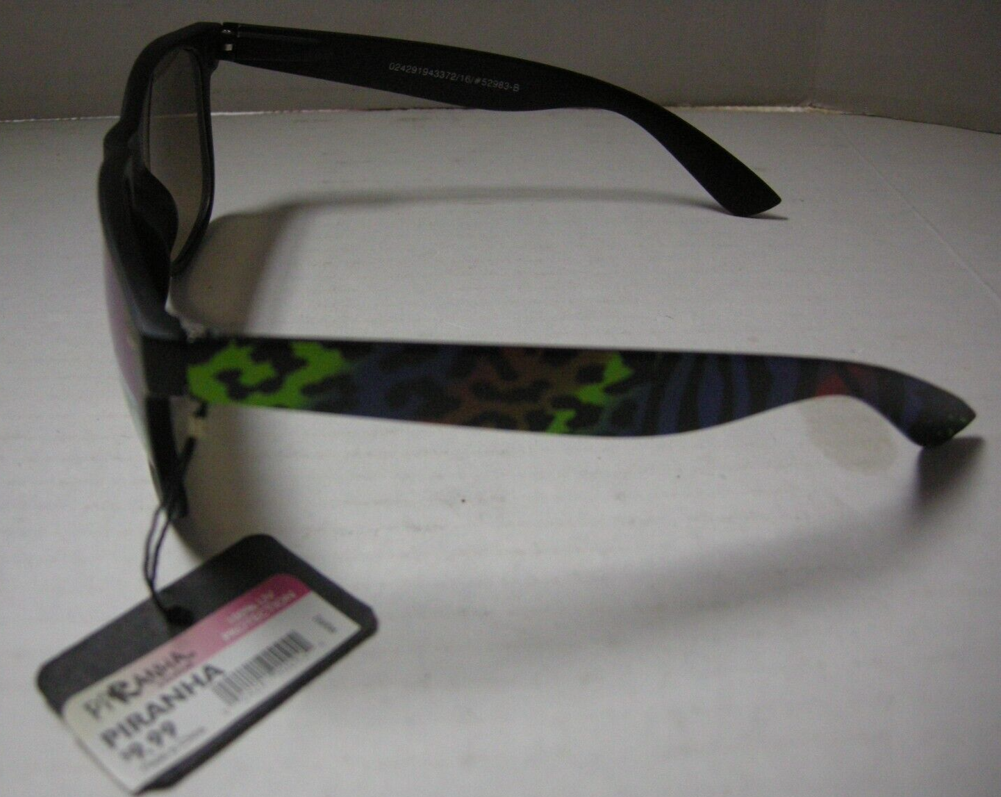Sunglasses -- * Brand new with tag. * Manufactured by Piranha. * Black frames with multicolor animal print temple pieces. * Plastic frames and lenses. * Temple pieces 5" long. * UV protection. * Shatter resistant lenses. Check our store -- Giftbarntexas -- for more bears and toys. Sign up for my email newsletters by adding my eBay Store to your Favorites. BX88Glasses#8