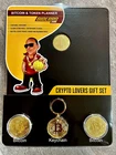 This is a beautiful Bitcoin / Crypto Currency Planner, Organizer, and Gift Set for Crypto Currencies and Bitcoin Lovers . This set was designed with the Bitcoin enthusiast in mind and it includes 3 Bitcoins which make great conversation pieces. We even designed the planner with one of the three bitcoins embedded into the front cover of the binder. This binder comes with over 15 pages designed to help categorize your crypto coins and tokens and profits or losses. This is not the usual empty binder that you find online with just a beautiful cover and blank pages. We have included even more lovely items such as a nice keychain which will be randomly packaged and you will receive gold, silver or bronze key chain, all coins will be gold. This set comes with gold plated rings that hold the pages in place and a beautiful emergency Rug Pull Insurance area on the inner side of the binder back. You will notice a RUG with a pull tab that says PULL FOR EMERGENCY. Once you open this rug area you will see a pocket that says…RUG PULL INSURANCE.. Inside this pocket we have included fake money but the idea is for you to purchase this for your friend who may have suffered a recent rug pull. The plastic packaging snaps together on its own so gently pull the package open by the top and the sides , go to the back inner cover, gently pull the rug away and you will see a pocket that says RUG PULL INSURANCE IN GOLD LETTERS.. Put some surprise cash in this pocket, snap the package back together and then give this to your friend. They laugh and smile when they open the rug pull area and only a crypto lover can truly appreciate this wonderful gift. It’s a beautiful leather type of material and the size is a bit larger than 8 x 10 photo or A4 paper. Don’t lose your passwords in a hard drive or some old computer. This planner is perfect for your passwords and more . Also it comes with Two sheets of very high quality lettering in 24kt gold or bright shiny Silver so choose what looks best and emboss the planner any way you wish. We will ship this internationally and get it to you as fast as possible usually within 10 days. Postage & Handling Worldwide