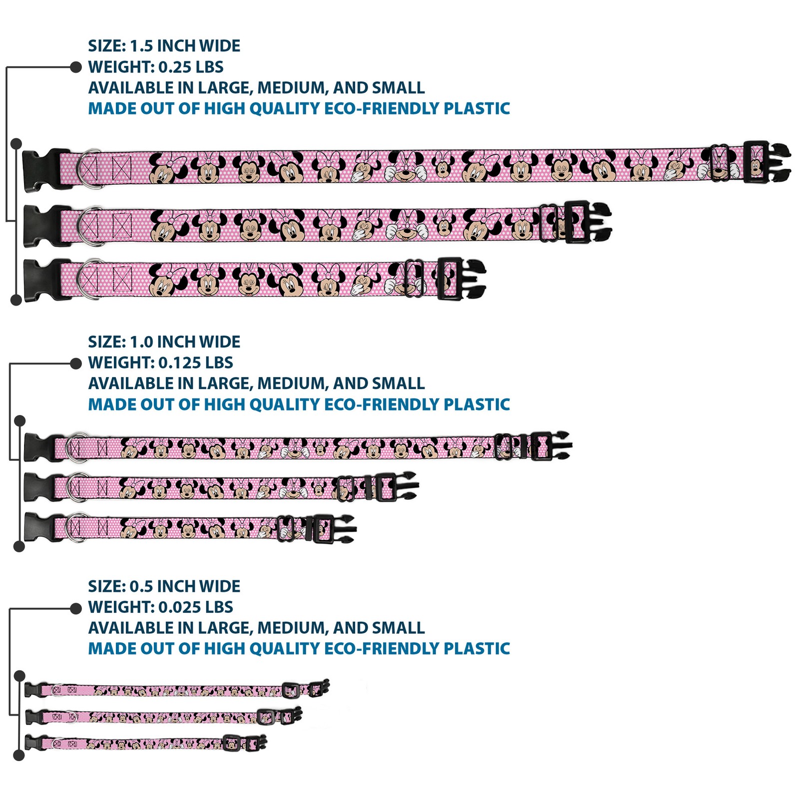 Further Details Title: Plastic Clip Collar Minnie Mouse Expressions Polka Dot Pink/White WIDE-Medium 16-23" Condition: New Release Date: 09/28/2016 Item Weight: 81g Item Height: 25mm Age Level: All Life Stages Brand: Mickey and Friends MPN: WDY093-1.5-M Item Length: 584mm Size: 1.5" Wide - Fits 16-23" Neck - Medium Number of Items: 38643 Type: Dog Collar Plastic Clip Buckle Material: Nylon Pattern: Dog Dimensions: 23 x 1.5 x 1 inches; 2.88 ounces Item Width: 38mm Color: Pink Description: Vibrant and bold, this beautiful, polyester dog collar is made to show off your dog's unique style through all the seasons. With an overengineered plastic buckle and strong D-ring, this durable collar can hold up to whatever your dog can dish out. This product is officially licensed by Disney. Closure: Buckle Dog Breed: All Breed Sizes Fits 16-23" neck size and is 1.5" wide. Vibrant and bold, this beautiful polyester dog collar is made to show off your dog's unique style through all the seasons. With an overengineered plastic buckle and strong D-ring, this durable collar can hold up to whatever your dog can dish out. This product is assembled in the USA by Buckle-Down and is officially licensed by Disney. Matching leads/leashes available Missing Information? Please contact us if any details are missing and where possible we will add the information to our listing.