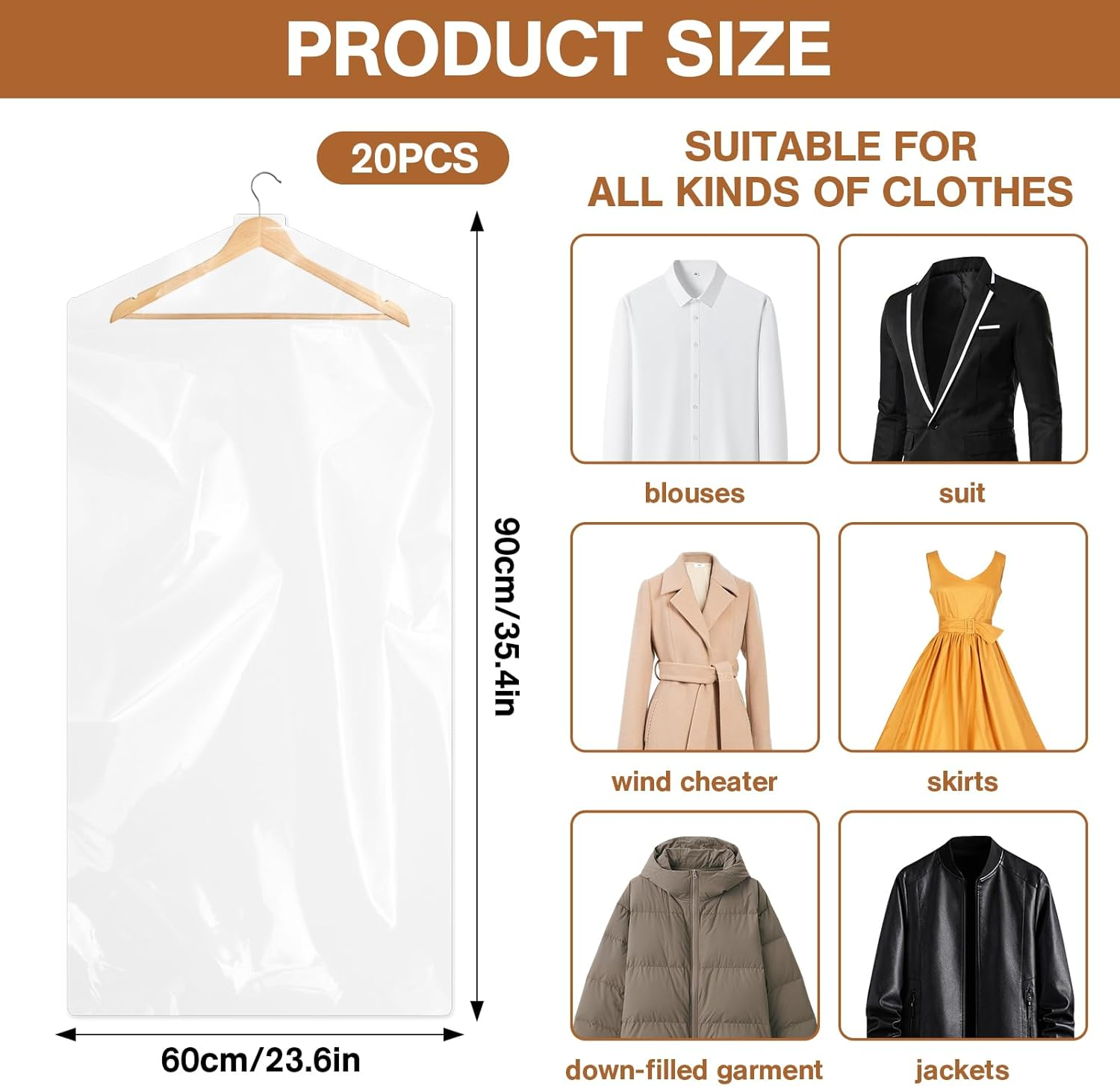 Store New Arrivals Add to Favorite View Feedback Contact Plastic Garment Bags Dry Cleaning Laundry Bags for Long Dresses Description Item model number GB-01 Closure Type Zipper Batteries Required? No Part Number 880420 Color white Material PE plastic Country of Origin China Item Weight 7 ounces Batteries Included? No Package Dimensions 9.25 x 8.66 x 0.63 inches Number of Pieces 20 20 Pack Garment Bags: You will receive 20 pieces of clear garment bags for hanging clothes. Enough quantity to meet your daily needs of clothes storage. Full Protection to Your Clothes: Adopting PE plastic material, the clear dry cleaning bag can protect your favorite clothes from dirt, dust, pets hair and unwanted odors effectively while hanging in your closet or during traveling. Large Clothes Protector Covers: Measuring 60 x 90 cm/ 23.6 x 35.4in, these clear plastic bags for clothes are suitable for most clothes with different length, such as jackets, suits, dresses, shirts, and pants. Transparent and Visiable: These dry cleaning bags for clothes adopt a transparent design, allowing you to see clearly what is inside and making it easy for you to find the clothes you want without opening the bag. Wide Application: Perfect for personal or commercial use, these clothes covers for hanging can be applied in dry cleaners, retail stores, tailor shops or at home. Product Description Good Helper for Closet Whether your clothes are always too much pet hair to tidy up? Whether your clothes always be wrinkle, dusted, faded? If so and you truly want to solve these problems. Try our clothes bags. These clear garment covers are designed to protect yout clothes. Clear Garment Bags for Hanging Clothes Full Protection to Your Clothes Adopting PE plastic material, the clear dry cleaning bag can protect your favorite clothes from dirt, dust, pets hair and unwanted odors effectively while hanging in your closet or during traveling. Transparent and Visiable These dry cleaning bags for clothes adopt a transparent design, allowing you to see clearly what is inside and making it easy for you to find the clothes you want without opening the bag..Note: Please be careful when using, it is soft and do not tear violently Large Clothes Protector Covers Measuring 60 x 90 cm/ 23.6 x 35.4in, these clear plastic bags for clothes are suitable for most clothes with different length, such as jackets, suits, dresses, shirts, and pants. Wide Application Introducing our 20-pack of clear garment bags, designed to cater to your everyday clothing storage needs. Crafted from premium PE plastic, these clear clothes covers offer full protection against dirt, dust, pets hair, and unwanted odors, while hanging in your closet or during travel. With dimensions of 60 x 90 cm/ 23.6 x 35.4in, these garment covers fit a variety of clothing items including jackets, suits, dresses, shirts, and pants. The transparent design allows for easy identification and access to your clothes without the hassle of opening each bag. Perfect for both personal and commercial use, these plastic garment bags are ideal for dry cleaners, retail stores, tailor shops, and home use. Size Size: 60 x 90 cm/ 23.6 x 35.4in Color: Transparent Material: PE plastic Size: 60 x 90 cm/ 23.6 x 35.4in ABOUT US We offer the best prices around on high quality products. Our E-store includes media such as books, movies, music and games while offering electronics, toys, sporting apparel, clothing, tools, general home, garden items and more. SHIPPING We are always working hard to ensure your package arrives as soon as possible. Please understand that some factors like weather, high postal traffic, and the performance of shipping companies are outside of our control. We offer free shipping to the lower 48 states and ship within 2 business days of payment, usually sooner. We do not accept P.O. Boxes. Please provide a physical address. For shipping outside of the continental USA, we only use eBay's Global Shipping Program.The item is shipped to KY and then sent to the rest of the world. International customers are responsible for all duties and taxes. Continue to check out in order to calculate costs for shipping the item to your country. Messages regarding eBay's Global Shipping Program MUST be directed at eBay EXCLUSIVELY. RETURNS We offer a 30-Day Return Policy on items which you are not completely satisfied with. You have the option for a full-refund or an exchange of the item. No returns are available on items shipped outside of the USA. PAYMENT We accept PayPal. CONTACT US This page content is yet to come Please ad us to your favorite seller and visit again later Thank You CUSTOMER SATISFACTION We try our very best to make sure every customer is completely satisfied. If there's a problem, message us! We're happy to help. WE ACCEPT Copyright © 2021 AutoDS. | All Rights Reserved