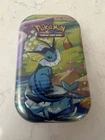 The Pokémon Prismatic Evolutions Mini Tin features a Vaporeon character card from the Evolutions set of the Pokémon Trading Card Game. Manufactured by Nintendo in the United States in 2025, this pack includes a standard-sized card made of card stock and metal material. The mini tin is factory sealed and contains booster packs for collectors to enjoy the English-language cards illustrated by The Pokémon Company Art-team. Recommended for ages 6 and up, this item is a sought-after addition to any Pokémon TCG collection.