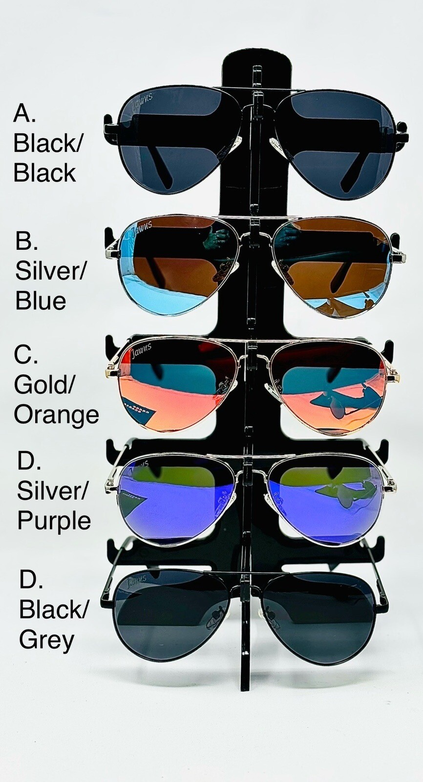 Designed and assembled in New York City. Polarized lenses for optimal clarity. Every purchase includes a custom branded hard-shell carrying case, dust bag, and microfiber cloth. Pick your favorite Color based off of the second image. A. Black/Black B. Silver/Blue C. Gold/Orange D. Silver/Purple When you purchase 2 Pairs : Receive 5% OFF EACH PAIR When you purchase 3 Pairs : Receive 10% OFF EACH PAIR When you purchase 4 Pairs or more: Receive 15% OFF EACH PAIR Please do not hesitate to reach out with any questions or request additional photos or you live video to help with the decision-making process.
