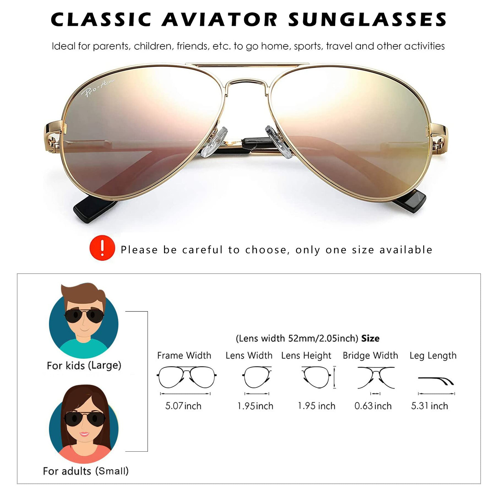 【POLARIZED AVIATOR SUNGLASSES FOR WOMEN MEN】-- Aviator Sunglasses for Women Men, these sunglasses get the classic aviator sunglasses look . Perfect for any occasion, these sunnies keep you looking stylish and chic while shielding your eyes from the sun's rays. 【HD LENSES ARE DESIGNED TO SEE BETTER】-- Enjoy crystal clear vision no matter where you go! Our Aviator Sunglasses are designed to maximize clarity while minimizing distortion and glare, giving you the best possible visibility in any situation.Polarized sunglasses eliminate glare and haze so your eyes are more comfortable and you can see better. Polarized lenses contain a special filter that blocks this type of intense reflected light, reducing glare. 【PERFECT FOR ANY OCCASION】 -- These Women Men Aviator Sunglasses offer 99% UV protection and clear vision,making them ideal for outdoor sports, such as baseball, golf, softball, cycling, climbing, driving, fishing, hiking, running, skiing and so on. 【DESIGNED FOR SMALL FACE WOMEN JUNIOR】 -- Lens width: 52 mm/2.05 ", Lens height: 50 mm/1.95 ", Bridge width: 16 mm/0.63 ", Frame width: 130 mm/5.07 ", Arm length: 135 mm/5.31 ". These classic aviator sunglasses fit for petite faces women. 【EXQUISITE PACKAGING】-- Comes with exclusive packing box, durable leather case, portable microfiber pouch, microfiber cleaning cloth, mini repair screwdriver, polarizing test card, user manual and store tag. These exquisite gift ideas package will be wonderful gifts for your kids! If anything wrong, please do not hesitate to reach out to us.
