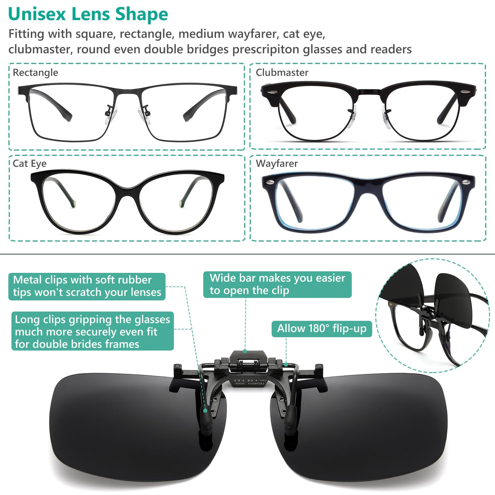Super easy to use clip on sunglasses, just snap and clip on / over your prescription glasses or readers, get the polarized sunglasses function with affordable cost, allow 180° flip-up TAC POLARIZED LENS, anti-glare from road, water and glass wall cause by sunlight reflection, good for driving and outdoor activities Special Category 4 Super Dark Black Polarized Lens: Block the most of visible light (only 5% visible light come through), shield children's sensitive eyes (Photophobia) from the bright sunlight, more comfortable vision in extreme conditions 100% UV PROTECTION LENS, blocking harmful UVA and UVB radiation from the sunlight STURDY CLIPS, silicone-covered long mounting bracket to protect glasses and prevent slipping. This premium clips with a big bar are easy to open, non-shrinking, impact and shatter-proof, wear-resisting and scratch-proof