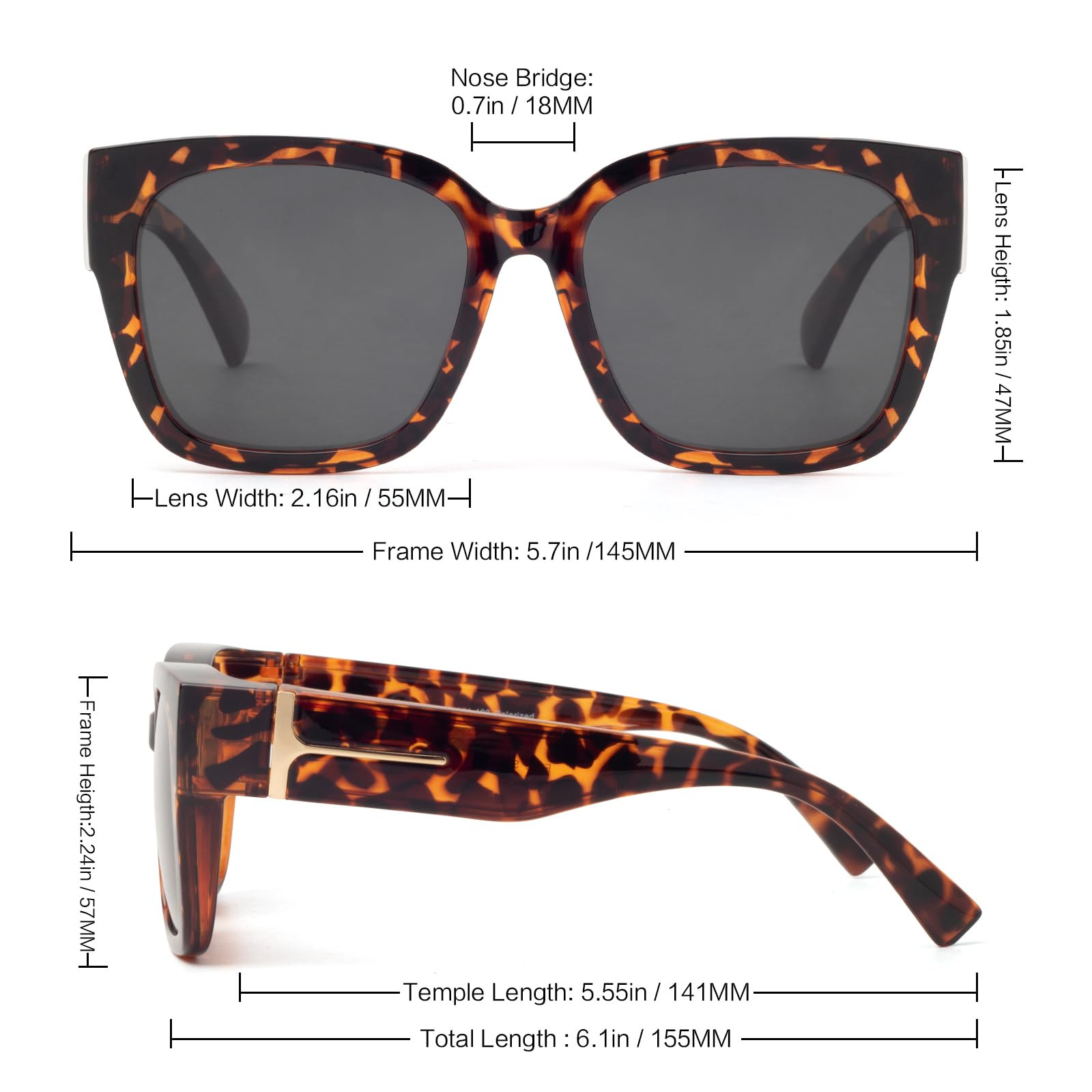 【Sunglasses Over Glasses】: These over glasses sunglasses are specially designed for women men who wear prescription glasses or reading glasses, large square frames are suitable for most face shapes and glasses shapes. These fitovers sunglasses can surely also be worn alone, stylish and practical. 【Lightweight & Comfortable】: Frame made of upgraded lightweight TR90 material, which is also more durable and flexible. Super light and very convenient to wear and take off with one hand when you are driving. You barely feels burdened when wearing them over the regular glasses. 【Polarized UV Protection Lens】: The lenses of our square oversized sunglasses are polarized and UV400 protective, reduce the glare reflected by roads, water bodies, snow and other horizontal surfaces, and relieve the discomfort of bright light on the eyes, also block UVA and UVB radiation 100%, protect your eyes from long-term UV damage and keep your eyes healthy when you go out. 【Versatile Using】: You can use our over glasses sunglasses for most outdoor activities such as driving, hiking, boating, biking, fishing etc., also a great helper for someone who just has eye sensitivity to glare or had cataract surgery. Sturdy internal hinge structure, comfortable recessed nose pads, ergonomic temple end-tips, all details ensure perfect performance. 【Purchase Advice】: Please measure your myopia glasses before purchasing these to fit over your glasses. Your glasses' frame length should be less than 140 mm/5.5 inches, frame height less than 50 mm/2 inches.