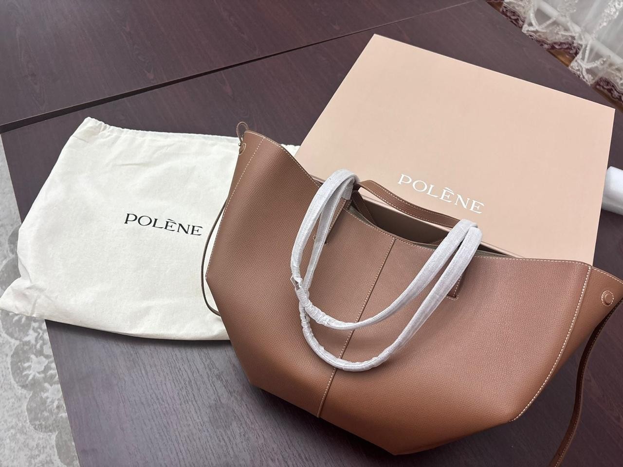 The Polène Cyme Large Tote Bag in Camel is a luxurious and stylish handbag made from 100% genuine leather in Spain. With a classic solid pattern and a brown leather handle/strap, this large shoulder bag exudes sophistication. The bag features zipper accents, pockets for convenience, and a versatile brown leather lining. The additional unbranded handle adds a touch of customization to this timeless piece from the Polene collection by Big Accessories. Perfect for any woman looking for a high-quality and fashionable accessory to add to her wardrobe.
