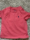 This is a pre-owned Polo Ralph Lauren baby boy short-sleeve t-shirt in a size 12 Months. The shirt features a solid coral or salmon pink color with a signature navy blue embroidered pony logo on the left chest. Designed for easy dressing, it includes a two-snap placket at the left shoulder. The garment is made from 100% soft cotton jersey fabric and has a standard crew neckline. It is in good used condition with no major flaws noted.