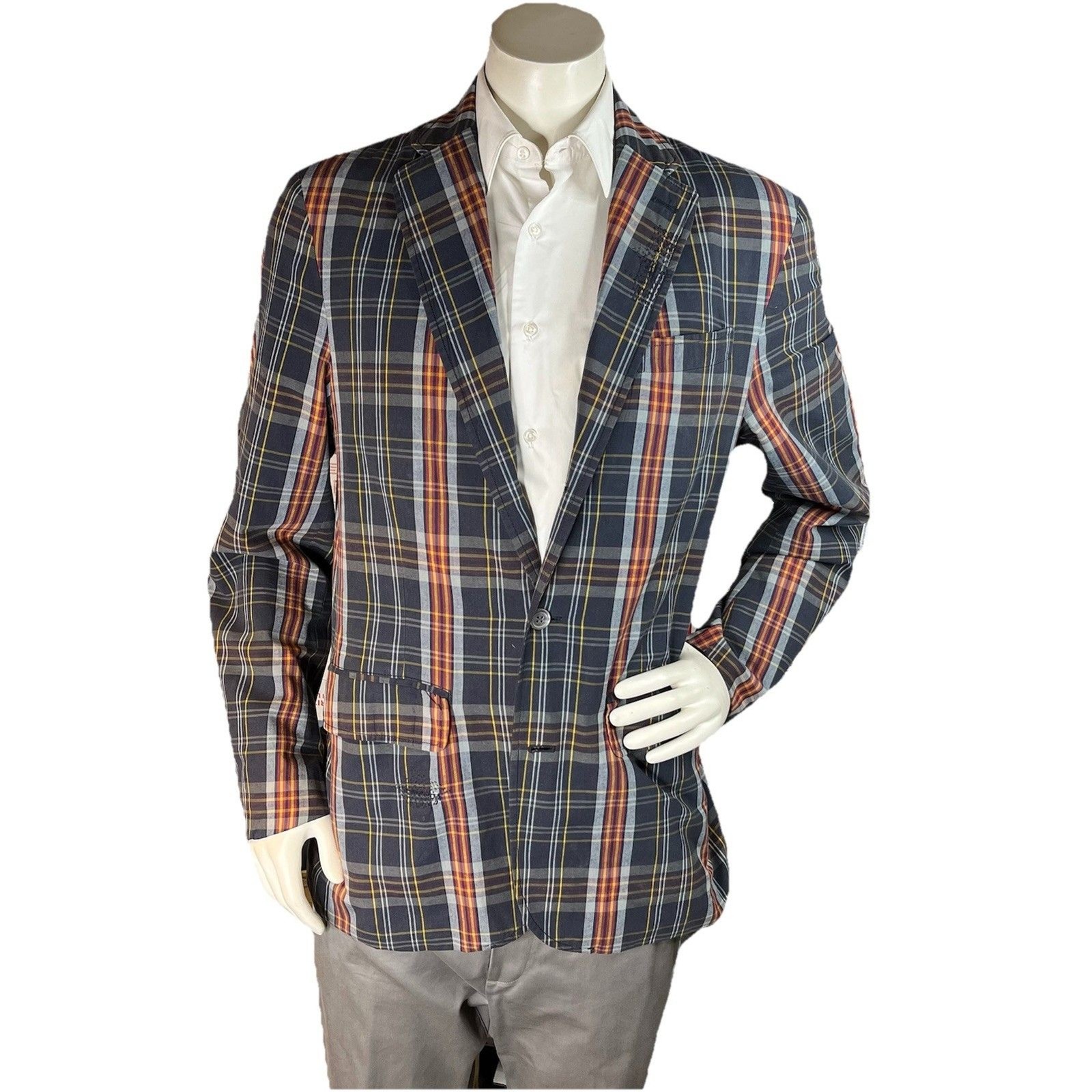 The Polo Ralph Lauren Vtg 90s Distressed Madras Plaid Sport Coat Blazer is a classic and preppy piece perfect for various occasions like travel, weddings, parties, or casual outings. Made of cotton with a viscose/rayon lining, this blazer features a notch lapel, single-breasted front with two buttons, and single vented back. The multicolor plaid pattern adds a vintage touch, while the 44R size ensures a comfortable fit for men looking to make a stylish statement with their designer jacket. Perfect for those who appreciate timeless American preppy fashion from the 70s and beyond.