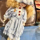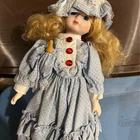 Vintage Porcelain doll in blue Victorian dress with bonnet and umbrella 25+ years old