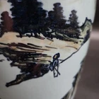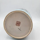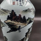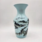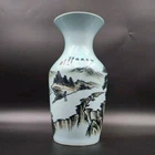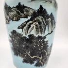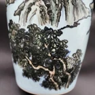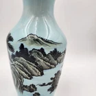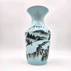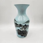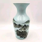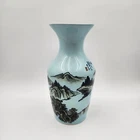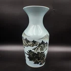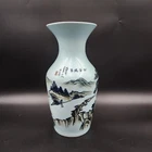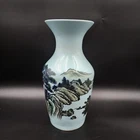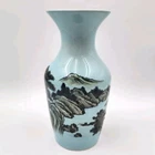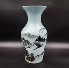 This Republic Of China period porcelain vase measures 14" tall and 6" diameter. The vase is hand painted and signed by the artist. It is substantial, weighing 4.6 pounds. The scene depicted on the vase is of a mountainous landscapemastery. male human figure wearing traditional garb. The vase is light blue with texturing on the areas of the vegetation. It is a beautiful handcrafted vase, and the artist has painstakingly created a very detailed impression with great skill and masterry.
