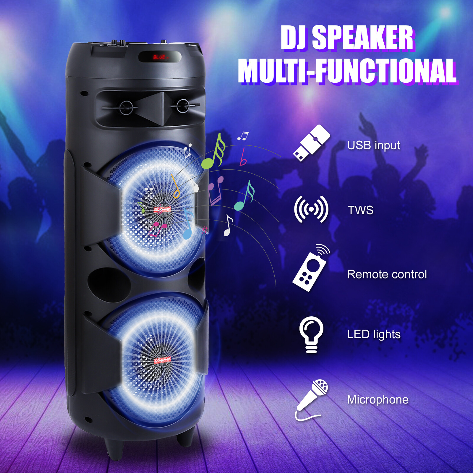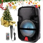 Bluetooth Speaker Portable 6000W Sub woofer Heavy Bass Sound Party System W/ Mic You'll receive the 8-Inch Portable Speaker with a micro usb charger, trolley wheels and handle for easy carrying, wired microphone. It is also equipped with a colorful LED light display and measures Feature: DUAL SPEAKERS & POWERFUL BASS : The efficient woofer can produce deep bass, and even if the volume is turned up, the midrange and treble can remain loud and clear. SMOOTH BLUETOOTH CONNECTION : Allows you to stream your favorite music directly from a smart phone, iPod, tablet, or any other suitable BT device within 10M/32 feet, without cables and without any hassle. MULTI FUNCTIONAL SYSTEM: With a built-in USB port, TF card reader, microphone input, and auxiliary cable input, our speakers can perform multiple functions. You can also play music from 33 feet away with your Bluetooth-enabled smartphone or tablet. PORTABLE SPEAKER: With and a retractable telescoping handle, this Bluetooth wireless speaker setup is incredibly portable and functional, making it the perfect karaoke machine for indoor or outdoor parties, tailgates, and gym classes. GREAT FOR KARAOKE: Whether you are hosting a birthday party, a bridal shower, a girls' night, or any other celebration, this party speaker with quality sound and a wired microphone is just what you need for hours of singing fun. LONG BATTERY LIFE: This wireless speaker has a rechargeable battery with long-lasting, 4-hour life—restricting you less by keeping the fun going. With this portable speaker, you can be the music taste maker at any party for kids or adults. Specification: Audio Input:Memory Card/Bluetooth/FM/AUX Built-in Battery: 18650 li-ion battery Battery capacity:3000mAh Charging time: 5-8 hours Play time: 5 hours (fully charged) Input Voltage: AC 100-240V 50/60Hz Output Power: 20W Peak Watt: 6000w Color:Black Package Includes: 1 x Wireless Party Speaker 1 x Wired Microphone 1 x Charging Cable 1 x 3.5mm AUX Cable 1 x Remote Control 1 x User Manual