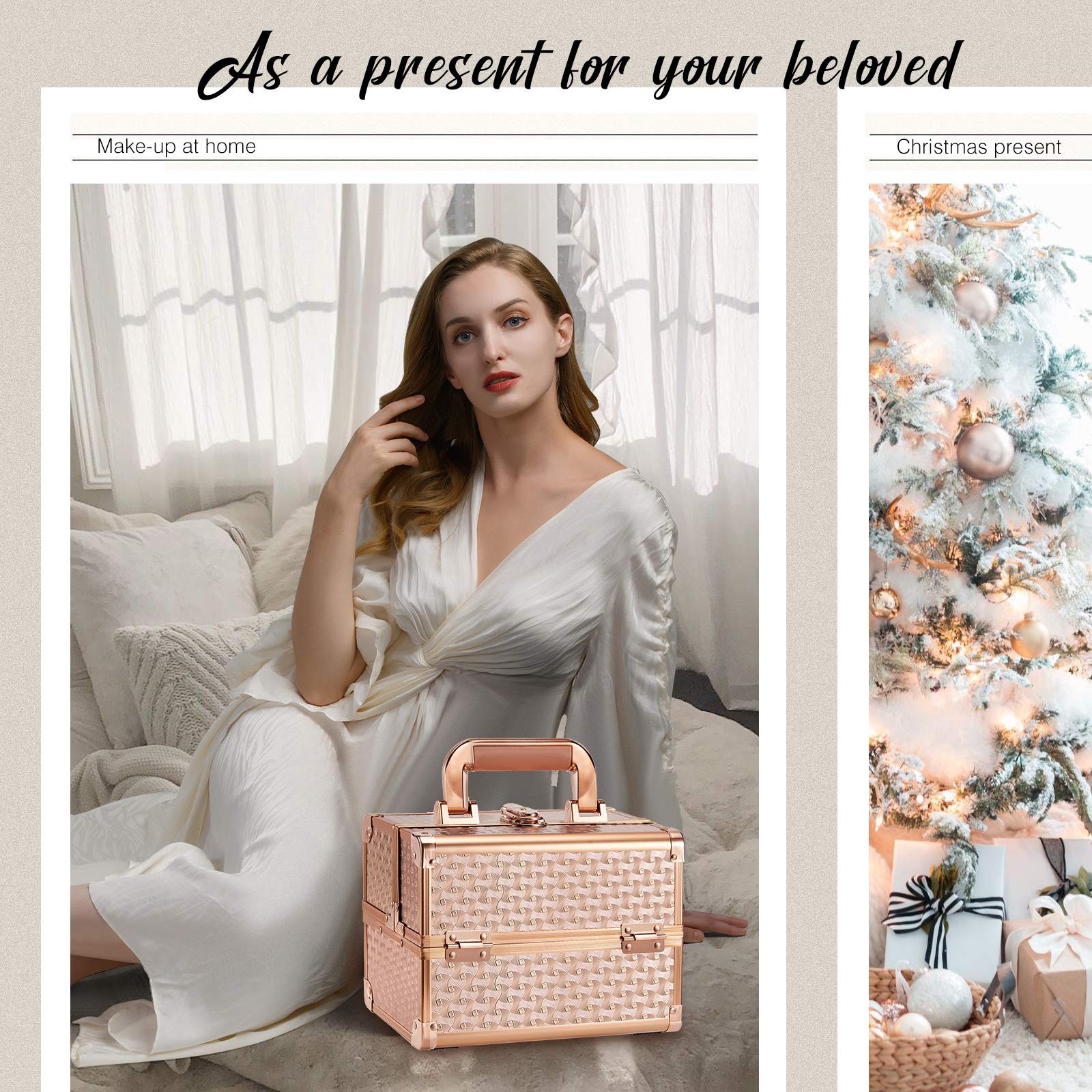 Features: Beauty Rose Gold with the specially pattern aluminum to match with the stereoscopic style surface. In case of travelling, the large handle with soft padding makes it a comfort. Cantilever trays build strong and versatile organizing space. Flexible structure to use at its most space but to remain compact when not in use. Specifications: Material: Grade-A Aluminum Size: 9.44 inch x 6.69 inch x 7 inch. (L x W x H). Color: Rose Gold Package contents: 1 x Rose Gold Makeup Box Note: Makeup brushes and other cosmetic accessories are not included, only for reference. Rose Gold Makeup Box: Makeup box measures 9.44 x 6.69 x 7 inches, making it an ideal size for travel. Made from high-quality materials, it combines sturdy ABS aluminum with metal-reinforced corners for excellent durability. Despite its strong construction, the box is lightweight and easy to carry. Its waterproof rose gold surface not only looks stylish and eye-catching but also protects your makeup from moisture and other outdoor elements. Makeup Train Case with Mirror: This makeup train case features an extendable cantilever 2-tier tray design that provides ample space for organizing your cosmetics efficiently. In addition, it includes a convenient mirror attached to the top tray, allowing you to view all your items at once. This thoughtful design enables you to access your makeup easily and speeds up your dressing routine, making the process quicker and much more straightforward. Makeup Case Easy and Convenient Cleaning: The tray bottom and case bottom are covered with stainproof plastic films, making cleaning quick and simple. These films prevent spills from soaking in and protect against scratches from everyday use. If your lipstick stains the trays, simply wipe the area gently with a damp cloth. After cleaning, the trays will look fresh and spotless, just like new. This smart design makes keeping your trays clean effortless, saving you time and effort. Portable & Lockable Makeup Organizer: This portable makeup organizer is designed for convenience and security. Its compact size makes it easy to carry, perfect for travel or moving your cosmetics. A comfortable, non-slip handle ensures a secure grip even when fully loaded. The sturdy lockable mechanism with key provides added privacy and protection, keeping your makeup safe from unauthorized access. Ideal for travel or shared spaces, this case offers peace of mind and reliable security for your personal beauty items. For Your Beloved: This stylish makeup case is the perfect way to keep her vanity tidy while adding a touch of sophistication. It’s more than just a storage solution—it’s a present that holds both makeup and memories. Ideal for Valentine’s Day, Christmas, birthdays, or any occasion, this practical and heartfelt present will be loved by those you care about, bringing happiness and neatness.
