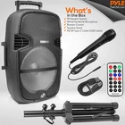 1000 WATT POWER: The high powered wireless karaoke PA portable bluetooth speaker is equipped w/ 15" subwoofer, 4-inch tweeter w/ 1000-watt peak power / 500W RMS at 4 ohms for full range surround stereo sound reproduction and impressive bass response.Waterproof : No COMPATIBLE WITH BLUETOOTH: This box type loud bluetooth speaker system is compatible w/ bluetooth for wireless audio streaming and works w/ devices like iPhone, android mobile phone, iPad, tablet, PC. Ideal for personal indoor home and outdoor use 4 INPUTS: Pyle bluetooth speaker karaoke PA system is equipped w/ a USB and SD card reader so it can serve as an MP3 player, a 3.5mm AUX input, and a 1/4” mic/guitar input. It also has FM radio and comes w/ remote control, wired mic, and tripod FLASHING DJ LIGHTS: The bluetooth party speaker with lights on wheels features multi-color flashing disco LED lights that will add life to any occasion which is great for patio parties or gatherings at night when a colorful presence is noticeable RECHARGEABLE BATTERY: These Pyle PA wireless speakers with bluetooth are great for karaoke, stage performances, & crowd control. It is fully portable w/ a built-in rechargeable battery, rolling wheels, & handle so you can take it anywhere you go -