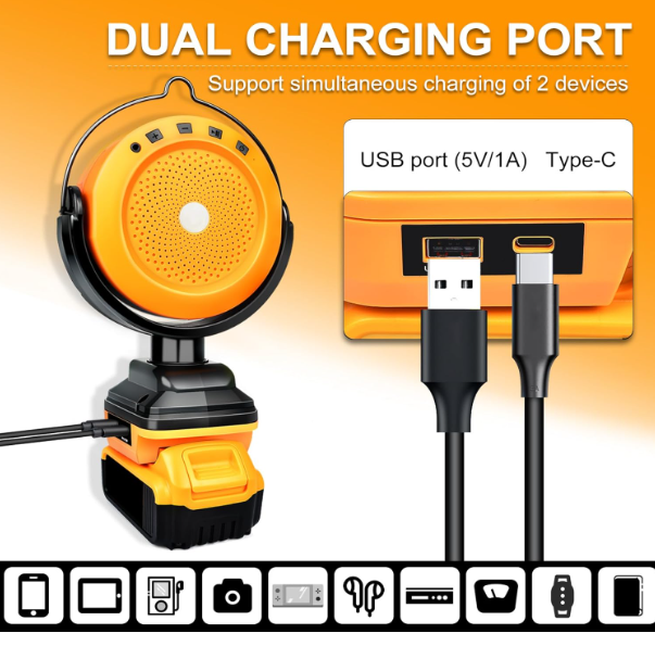 Bluetooth Speaker for DeWalt 18v 20v 60V Battery Bluetooth Speaker for DeWalt 18v 20v 60V Battery, Cordless Portable Speaker with USB & Type-C About This Item: Compatible with DeWalt 18v, 20v, and 60V batteries. Wireless music, deep bass, and clear treble provide high-fidelity sound quality. Equipped with USB port (5V/2A) and Type-C charging. Please note: This port is only for emergency fast charging and cannot be used to connect speakers to play music. Supports Bluetooth 5.3 for fast pairing. Also includes AUX 3.5mm input for non-Bluetooth devices. (Package includes audio cable) Compact, cordless design for easy portability. Hidden handle allows for convenient carrying. Battery lasts up to 48 hours of continuous playback. Automatically turns off after 10 minutes of inactivity. Compatible with DCB181, DCB182, DCB200, DCB203, DCB204, DCB205, DCB206, DCB205-2, DCB204-2, DCB206-2. Batteries not included. Common Questions: Does it connect to non-Bluetooth devices? Yes, via AUX 3.5mm and included audio cable. How long does the battery last? Up to 48 hours on a single charge. Does it charge batteries when connected to power? No, it only charges mobile devices via USB/Type-C. Is the speaker durable? Customers report it is sturdy and suitable for job site use. Does it come with batteries? No, it is compatible with DeWalt batteries but they must be purchased separately. Product Details: Brand: Fiihio Speaker Maximum Output Power: 80 Watts Connectivity Technology: Bluetooth Audio Output Mode: Stereo Mounting Type: Flush Mount Offered exclusively by Sweetgalsshop