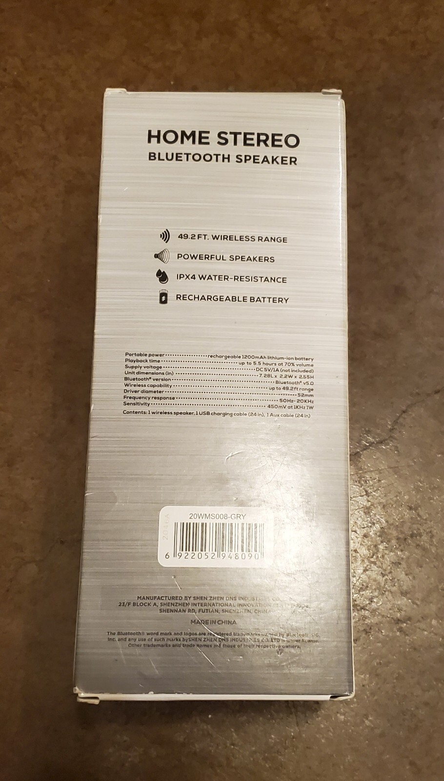 Get ready to experience high-quality sound with this portable Bluetooth speaker system from Shen Zhen Dns Industries. With a wireless range of 49 feet, you can enjoy your favorite music from a distance. The rechargeable speaker is IPX4 splashproof, so you don't have to worry about water damage. This rectangular-shaped speaker measures 7.5 inches in length, 2.5 inches in height, and 2.25 inches in width. It comes in a stylish gray color and has AUX audio inputs for added convenience. The model number is 20WMS008-Grey and it is manufactured in China. Buy this unit today and enjoy crystal clear sound wherever you go!