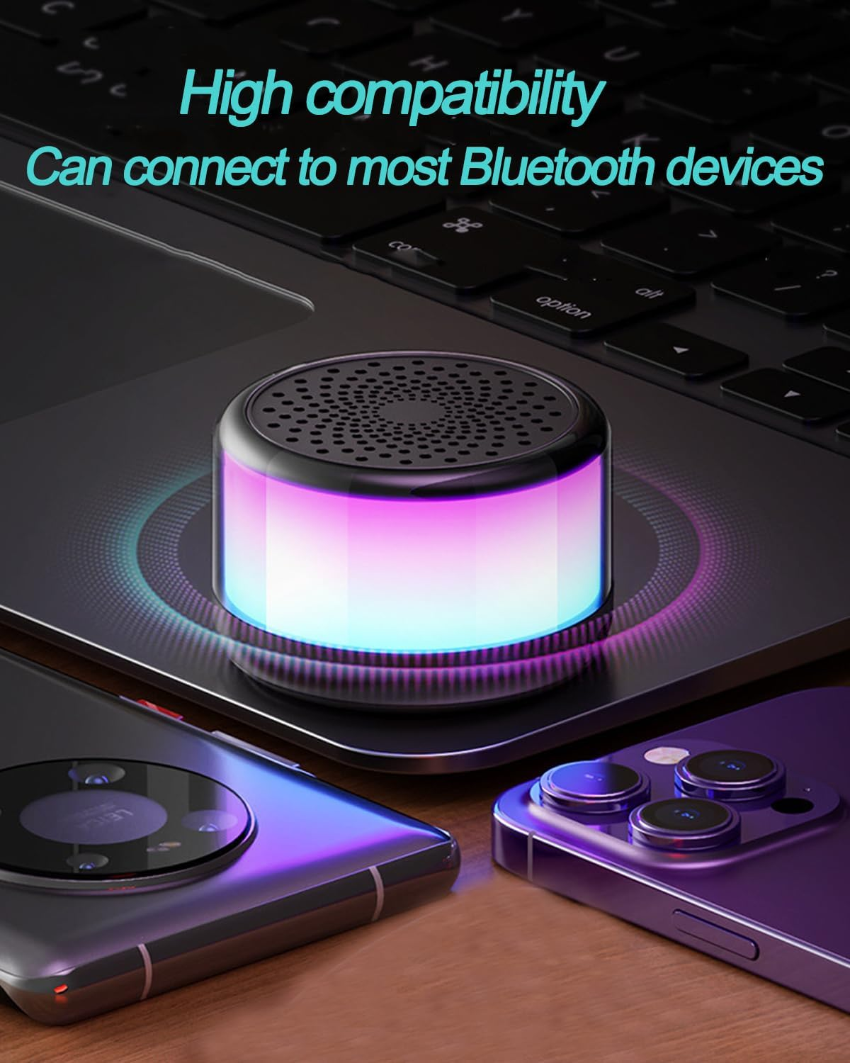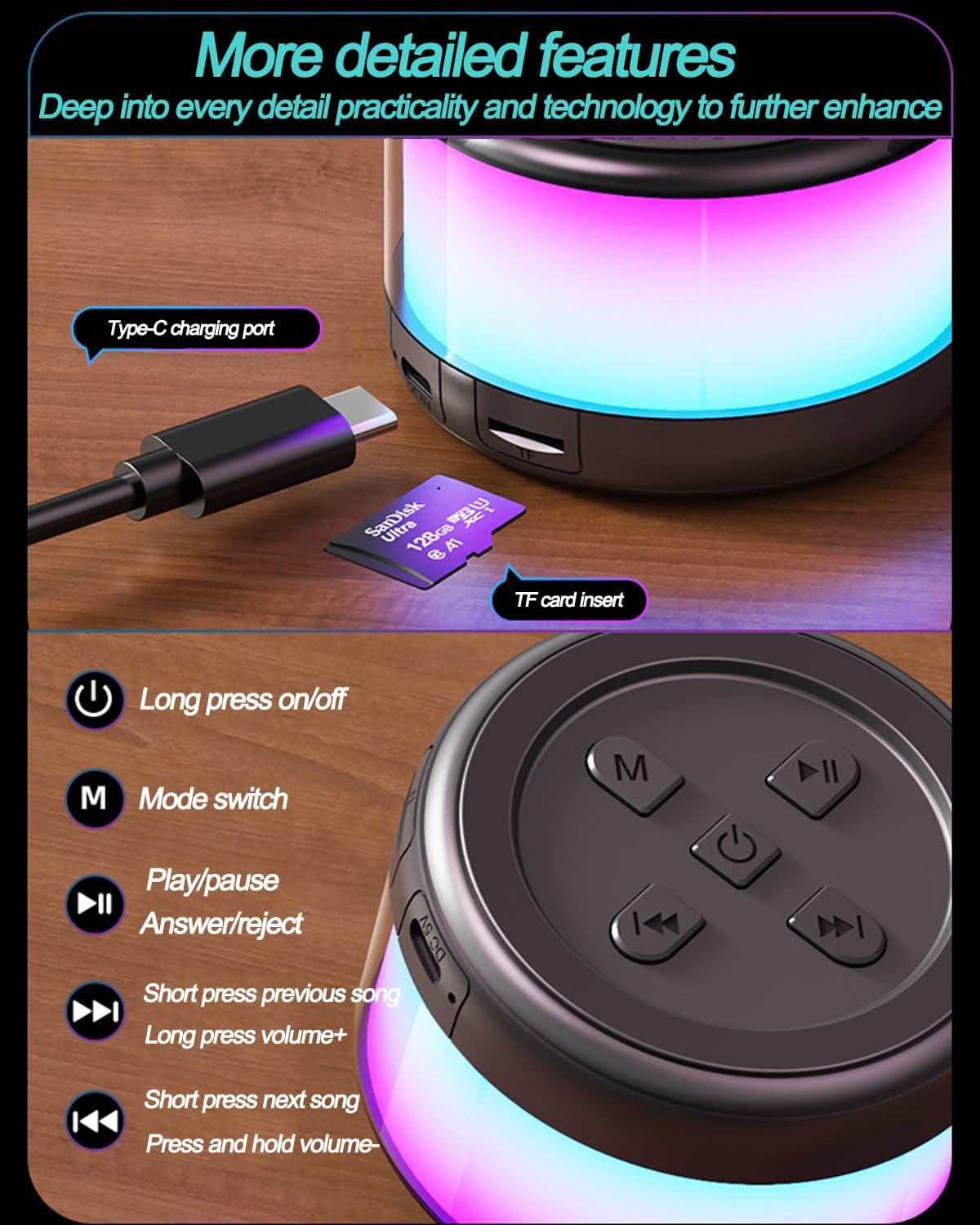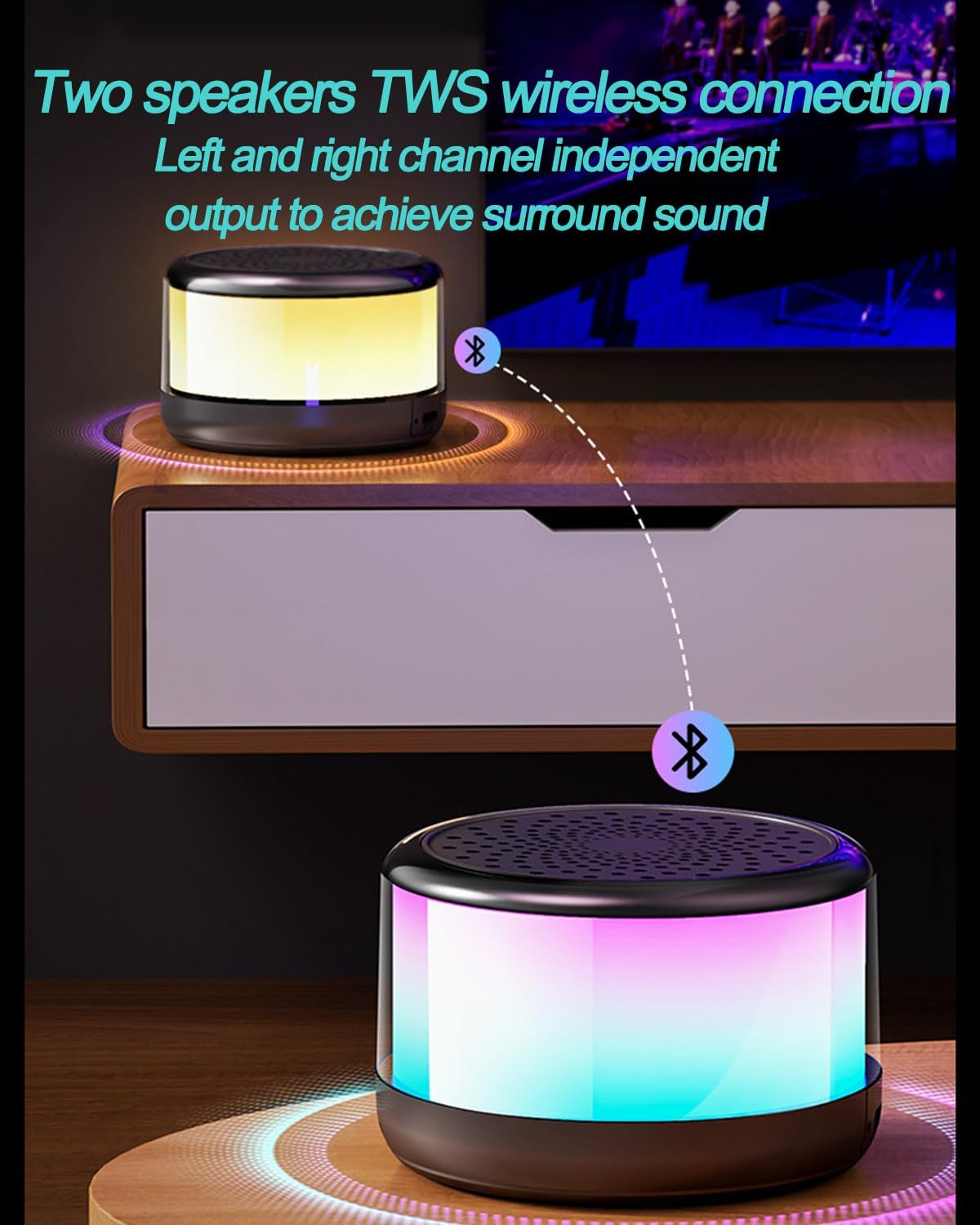 🔶360 degree all-round sound🔸 Portable Bluetooth speaker with advanced audio processing technology can provide even, balanced sound without distortion even at maximum volume. It is a round speaker, the sound is not muffled even if you are beside or behind the speaker compared to a normal box shape. You can enjoy the immersive feeling and all the sounds from the speaker are crisp, natural, realistic, and free of scratches. 🔶Bluetooth 5.3 Universal Matching🔸Bluetooth speaker with lights is equipped with Bluetooth 5.3 advanced chip to provide faster and more stable Bluetooth connection within the normal range of 33 feet/10 meters. Easily connect to your Phone, amsung, TV, computer, laptop and other mobile devices via Bluetooth or Auxiliary for all-day playback and enjoy music anytime, anywhere. Buy two of this bluetooth speaker, you will have a pair of speaker to play stereo music sync wirelessly. 🔶Lightweight and Ultra-Portable speaker🔸 Only 268g weight make it easy to carry. Stylish and compact structure with Diamond design, you can play the bluetooth speaker comfortably with one hand. So you can take it with you and enjoy great music, whether indoors or outdoors. 🔶Breathing RGB Light🔸 Wireless bluetooth speaker is not only a speaker, but also a unique night theme light, when you enjoy the music, the light will flash with the music, the portable wireless speaker with gradient light will really bring you Come for the party vibe. Lighting effects can be turned off at any time to meet your different needs. 🔶Best gift choice🔸Cute and delicate tiny speaker with powerful sound and beautiful lights, make it the best gift choice for kids ,family and friends. It can be used on any occasions, such as used for Yoga, in friends party, go camping outside with family and friends, Christmas Day, Easter Day, Thanksgiving Day, Birthday, anniversary, Mothers Day, Fathers Day, Halloween,wedding, etc. Product Description RGB Colorful Light Show This mini bluetooth speaker has several light modes which can creating a gorgeous light show that adds an extra feelings to your listening experience and you can also switch freely. The lighting changes as the melody changes, our bluetooth speaker can light up your life and let your life become more interesting whien you are listening your favorite music. Whether it's for yourself, a child or a loved one, it's a very thoughtful gift. Easy Operation Update individual buttons to switch and off easily! Now your music lives on your smartphone or tablet, with a simple tap of your finger. Bluetooth And TF Card Mode Bluetooth speaker using the new Bluetooth version has lower latency and strong anti-interference immunity. Also, support Micro SD card. It's a great choice for outdoor speakers when Bluetooth connectivity isn't an option. Stylish design, beautiful room decoration Functional, wonderful gift idea. 360° panoramic stereo sound 360 ° full range of cinema-grade stereo surround HIFI-level sound any position is the C position, every angle has a good sound. TWS Interconnection With TWS interconnect technology, our speaker support the connection of two devices at the same time, seconds to enjoy stereo surround sound, double enjoyment. Multiple Devices Support The Bluetooth speaker uses the Bluetooth 5.3 standard which provides a faster and more stable connection within 10 meters. It pairs easily with most devices: phone, MP3, laptop. Hands-Free Calls Speaker built-in microphone, When a cell phone is connected to the speaker, you can make calls through the speaker's microphone without having to pick up the phone again. Unable to connect the device automatically. 1. The product needs to manually connect to Bluetooth when the first time you use it. It automatically goes back to the last paired Bluetooth device when next time. 2. Bluetooth device is on and in a relatively close range. Why the second device cannot pair with Bluetooth Speaker? When you use two devices simultaneously with the same Bluetooth speaker, you need to disconnect the speaker on first device before connecting the second one. This will ensure that the second device can properly connect and function with the speaker. What is the Playtime for this speaker ? The speaker can play up to 4-6 hours with the light off. However, the actual playtime may vary based on factors such as volume level, audio content, and usage. What's included in the box? 1 x Bluetooth Speaker 1 x USB charging cable 1 × User manual