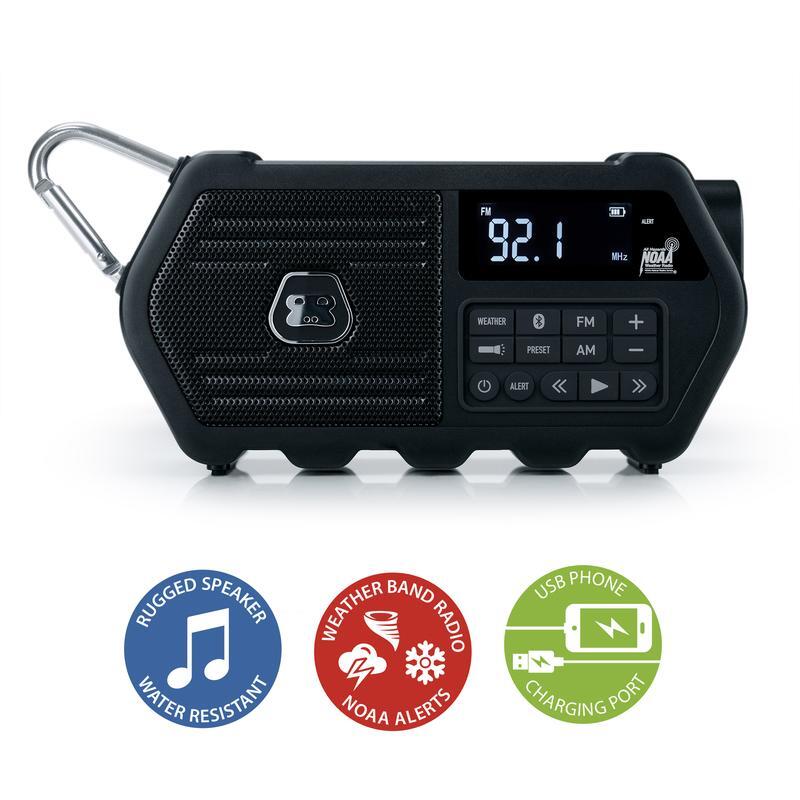 COMPACT AND FUNCTIONAL The G-Storm was designed to be a go anywhere speaker with the added functionality of weather radio, NOAA alerts and a flashlight. The handy carabiner clip makes it easy to keep by your side whether your hiking, traveling, or just commuting. G-STORM FEATURES Bluetooth audio connectivity, AM/FM/Weather band radio give you easy convenient listening options. Set up to receive NOAA Alerts to keep you up to date on weather and emergencies in your area. The built in flashlight can also be used as a strobe in an emergency. With a built in rechargeable battery and an optional backup with AA batteries, you’ll be able to use it even when the power goes out. The USB port can charge your phone or other usb devices including wireless earbuds, and smart watches. The IPX4 water resistant rating provides some extra durability in wet outdoor elements. G-STORM by G-Project Wireless Bluetooth Speaker with Weather radio and NOAA Alerts CONNECT QUICKLY AND EASILY IN SECONDS to Bluetooth devices including smart phones, tablets and laptops/PCs RECHARGEABLE BATTERY allows for ups to 15hrs of on the go audio playtime AM/FM RADIO to tune in to your local stations WEATHER BAND RADIO AND NOAA ALERTS allow to you listen to the weather and get alerts for local emergencies USB CHARGING PORT allows you to plug your phone or device in to keep it charged CERTIFIED IPX4 rating so it’s ok to get wet ON BOARD CONTROLS allow you to play and skip tracks wirelessly with buttons right on the speaker FLASHLIGHT BUILT IN gives you added convenience in the dark, or strobe function when needed HANDY CARABINER let’s you clip and go