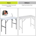 〖Portable Folding Camping Table〗-- Our fish cleaning table features a portable design with foldable legs for easy storage and transportation. You can take it with you on your next camping trip or fishing excursion with ease. 〖High Quality Table Top Surface〗-- Our table features a high-quality HDPE top surface that can load up to 440 LBS, which is tough and durable. This heavy-duty material can handle various operations and provide you with a reliable work surface for years to come. 〖Sturdy and Safe Foldable and Lockable Leg〗-- The table's foldable legs have a lockable feature that ensures stability and safety while you're working on it. Our table design is made to be sturdy and solid, providing you with a safe and secure work surface. 〖Connectable Sink with Faucet for Easy Cleaning〗-- Our fish cleaning table comes with a connectable sink that allows you to use fresh water to clean your table and food with ease. The faucet is easy to connect, making cleaning up a breeze. 〖Versatile and Multi-functional Table〗-- Our folding fish cleaning table is not only suitable for cleaning fish and wild game but can also be used to clean different meats, fruits, and vegetables. Its versatile design makes it an excellent choice for any outdoor activity.