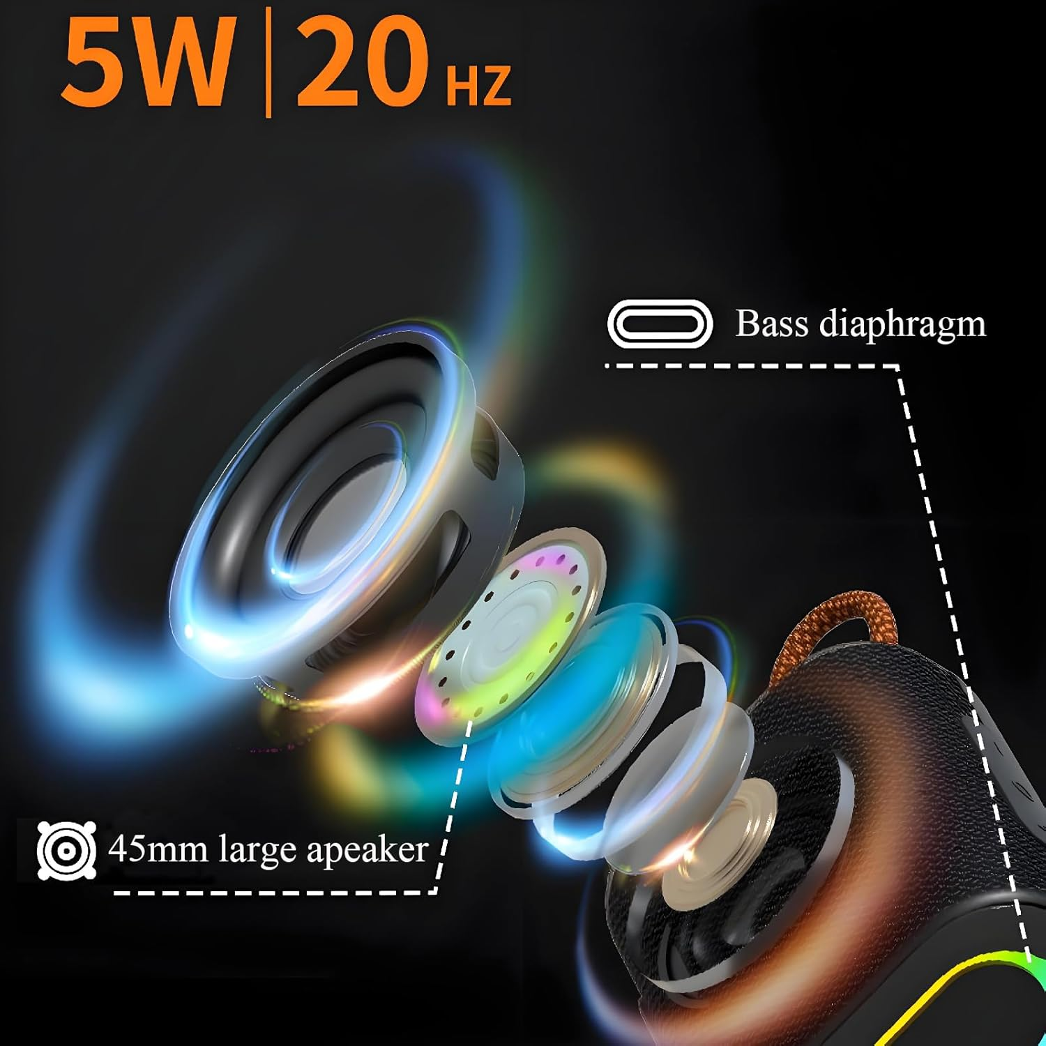 Vibrant RGB Lighting & Customizable Modes: 3 dynamic RGB light effects enhance your music experience, creating a lively ambiance for parties, bedtime, or relaxation. IPX5 Waterproof & Durable Build: IPX5-rated protection against water splashes and dust, paired with ABS+silicone rugged construction, ideal for pool parties, camping, or rainy-day use. Crisp 5W Sound & Wide Compatibility: Features a 52mm external magnet speaker delivering 5W clear audio with 20Hz-20kHz frequency response, compatible with Bluetooth 5.4, AUX, and TF (microSD). Long Battery Life & Fast Charging: 1200mAh battery provides up to 8 hours of playtime at 80% volume, and fully recharges in 3 hours via 5V/1A USB input. Portable & User-Friendly Design: Compact size, intuitive button controls, and lightweight build make it perfect for travel, gym, or daily indoor entertainment. Bluetooth Speaker IPX5 Waterproof with 3 RGB Light Modes, 8H Playtime, 5W HD Sound, TF/AUX Support, Portable for Outdoor/Indoor Use