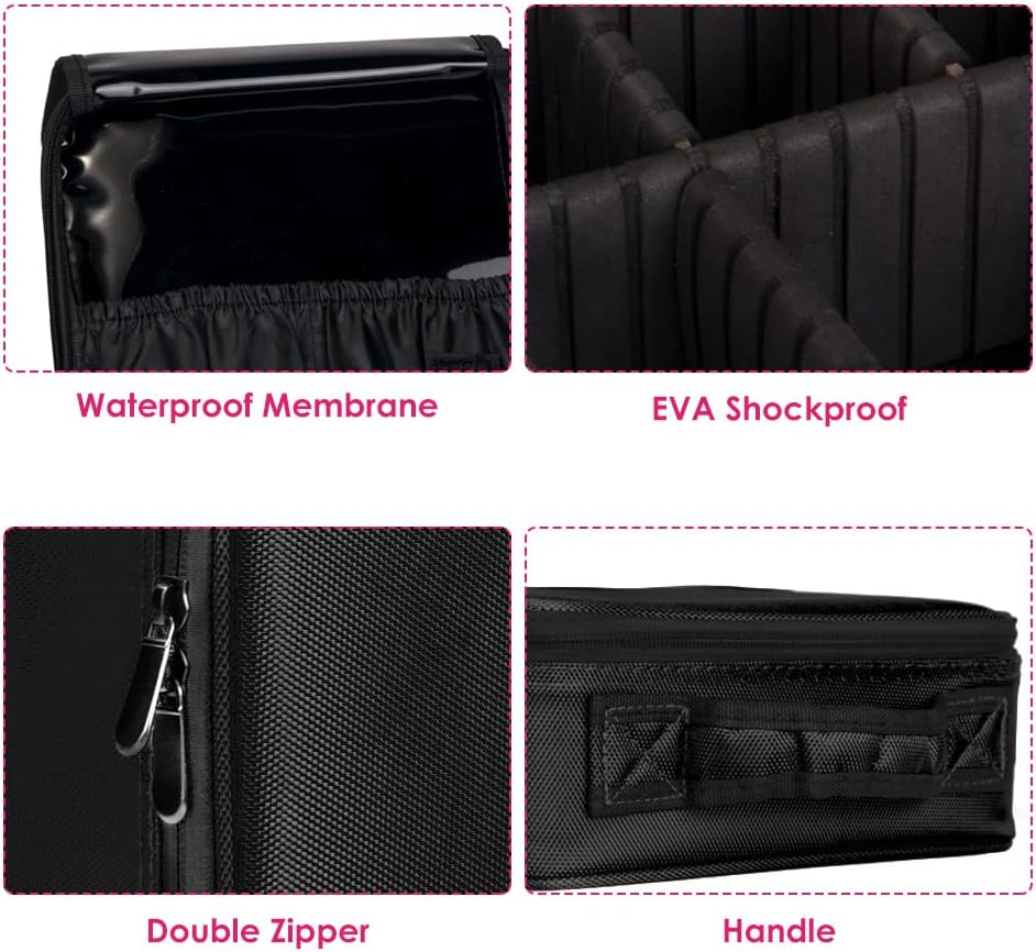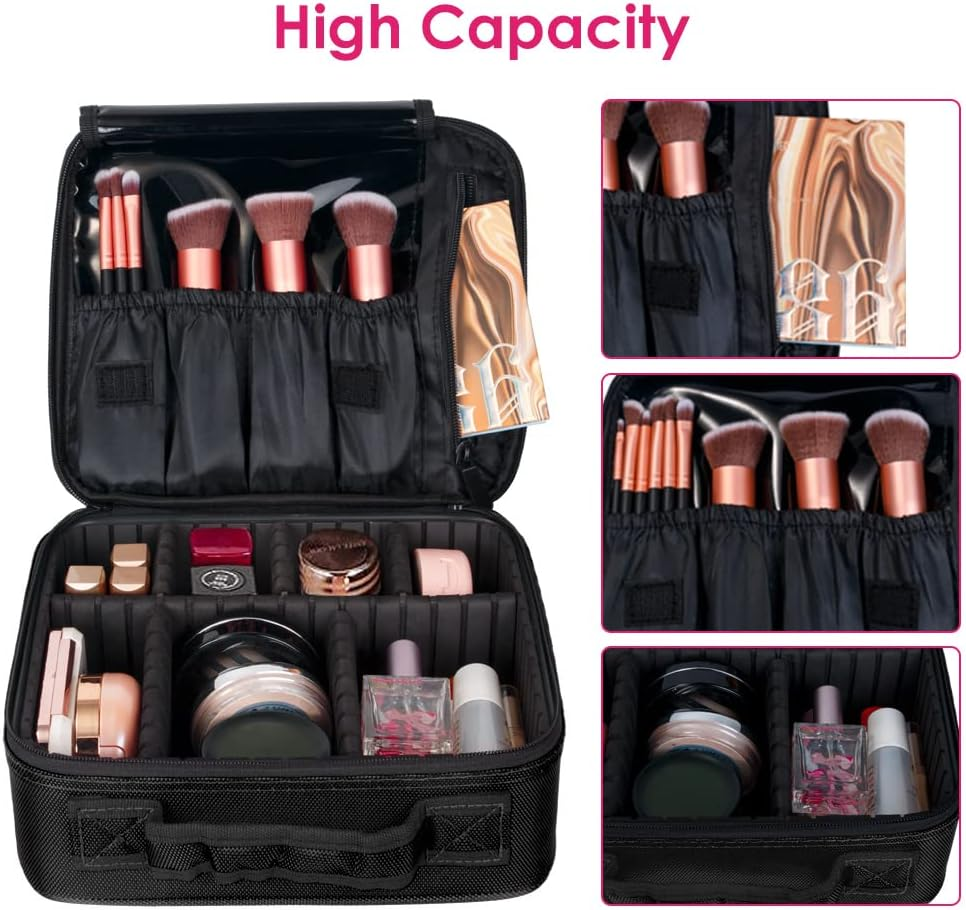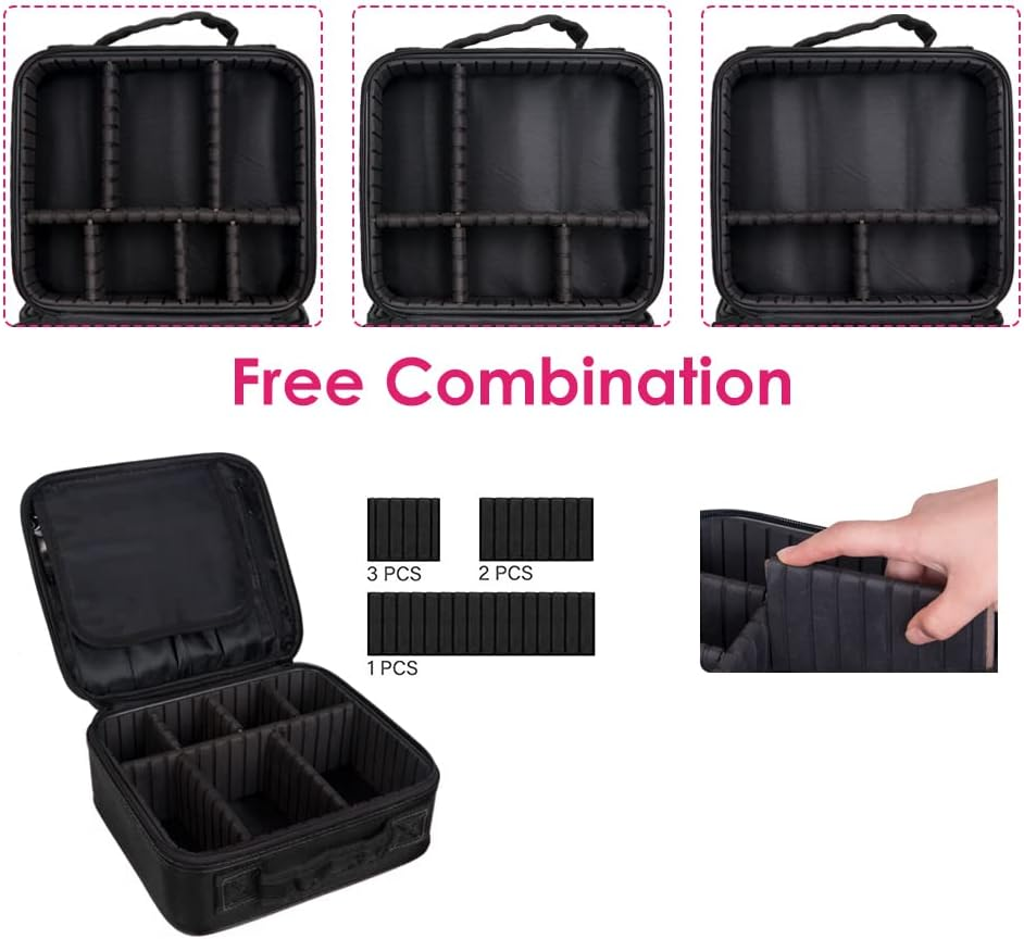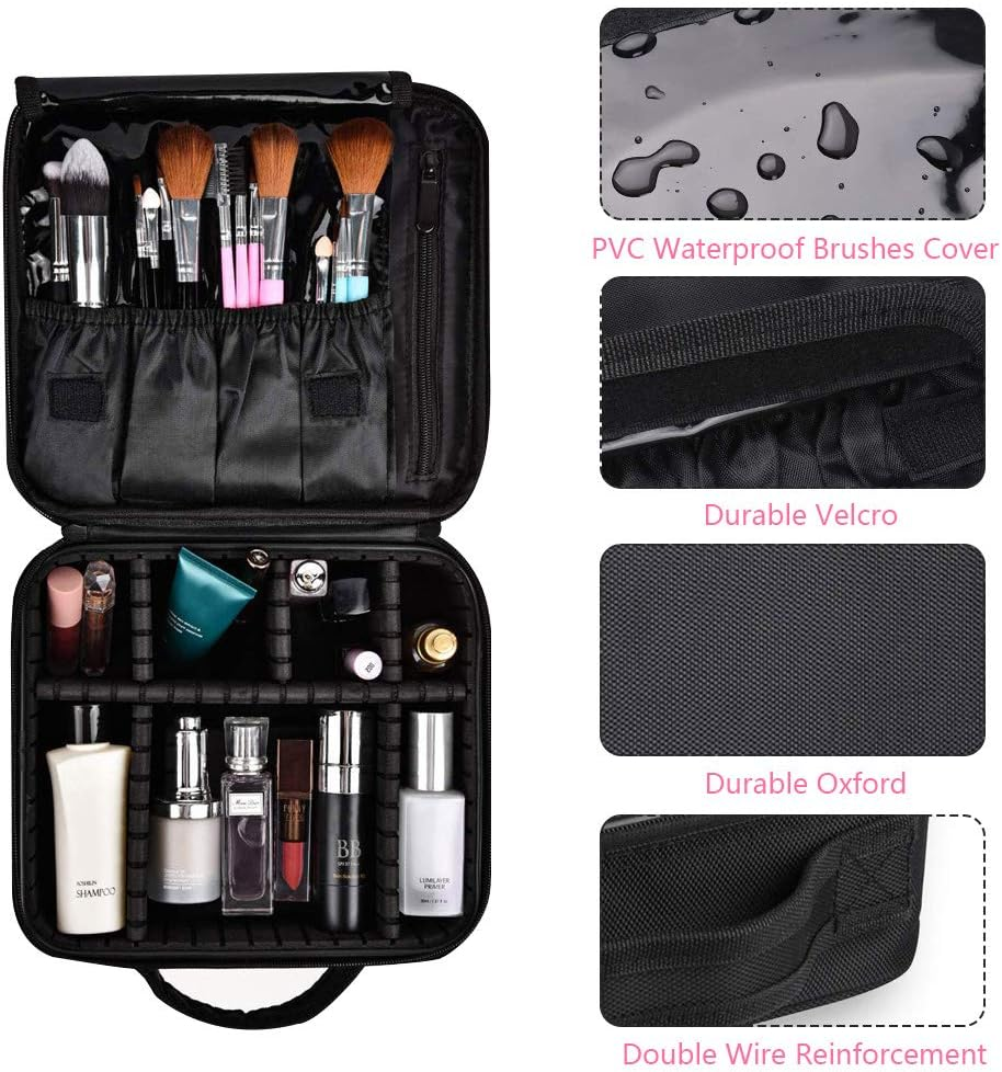 Adjustable Compartment --- Our makeup travel case comes with 5 adjustable EVA dividers, you can move the partitions as needed to fit different cosmetics and keep them perfectly separated and organized. You no longer have to worry about messy small pieces, so it can greatly save you time. Large Capacity --- This Makeup Bag has enough space to store your makeup and cosmetic accessories, like lipstick, lip gloss, makeup brushes, eyeshadow, makeup palettes, hairbrushes, skin care products, nail polish, nail art tools, shampoo and so on. Compact size: 26*23*10cm / 0.4*9*3.9’’. Premium Material --- Made of high-quality PU material and EVA high-density partition, the pencil box is durable and quality guaranteed. The pencil bag stores and organizes your pencils as well as protect them from dust and damage. Multifunctional Bag --- The perfect multifunctional organizer can not only store cosmetics, but also can be used to store jewelry, electronic accessories, digital cameras, and is a good helper for makeup lovers and travelers. Great Partner for Travel --- The professional makeup case can be cross-body, over the shoulder, or backpack. Allow attaching to trolley case. Portable carry handle for easy lifting or hanging. Product Description SlowTon Travel Makeup Case Professional Cosmetic Makeup Bag Organizer Makeup Boxes Focus on your beauty! 1.High quality: durable Oxford cloth, sturdy stitching process, able to withstand the weight of the pull. 2.Unique design: the traditional cosmetic bag fusion acrylic frame, cosmetic protection, adjustable partition so that cosmetics neat and orderly, brush pouch plastic and detachable acrylic frame, easier to clean cosmetic residue. 3.Travel portable: reasonable size, do not waste any space, you can put into your luggage, free to build yourdressing table. 4.Makeup brush space: 4 solt pockets, fit 8.5 "brushes, other eyeliner pliers, tweezers, data cables and more, covered in plastic, protect the individual space of your makeup brush, easy access. 5.Great gift: This is a multifunction accessories case, gift to family and friends this is definitely a surprise. Tips: The EVA partition in the makeup case is fixed by glue. So there could be some smell in the bag. But the smell will be removed after 2~3 days when you open it. The smell is non-toxic, please don't worry about it. Note: Cosmetic Accessories Not included.