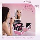 Mermaid Pink Makeup Box: The size of the travel makeup organizer is 9.44 x 6.69 x 7 inches. It is suitable for makeup artists from beginners to professionals. ABS aluminum and metal reinforced corners have good wear resistance and are lightweight and durable. With its waterproof glitter pink surface, the makeup case is an excellent protection for outdoor cosmetics. The shade of color changes as it captures light from different angles. High Capacity Train Case: Storage is flexible to fit in various sizes of cosmetic products such as your toiletries, nail polish, essential oils, jewelrys, paint brush, and crafting tools. There is large bottom space for palettes and even travel-size bottles. Cleans up Easily: Stainproof plastic films cover the tray bottom and case bottom for easy cleaning. There is no risk of spills or scratches. If your lipstick stains the trays, simply wipe them with a damp cloth and they will be as good as new. Makeup Train Case with Mirror: With an extendable cantilever 2-tier tray and a mirror attached to the top tray, the makeup train case lets you see all your items at a glance, making dressing up quicker and easier. Perfect Present for Your Sweetheart: This makeup organizer case keeps your dresser neat and clean. As a gift, it is stylish enough and will store many great memories. They will be happier when receiving such a wonderful gift on Valentine's Day, Christmas, New Year, Birthday, Wedding, and so on. Product Description Makeup Organizer Case Cosmetics Makeup Tools Foundation Lipstick Perfume Eye shadow Palette Brushes & Eyeliners Nail Kits Case Nail Polish Dip Powder Nail Art Sequins Nail Tips & Nail File Set Cuticle Trimmer & Pusher Electric Nail Drill Nail Lamp Craft Case Craft Sticks Assorted Sequins Pigment Scissors Glue Felt Pieces Mirror Mirror attached on the top tray for convenient makeup. Shiny Pink The makeup case comes in an exclusive style with diamonds bump on the pink surface. The shade of color changes as it captures light from different angles. Stain-proof Films Stain-proof plastic films lay on both tray bottom and case bottom. Key Lock It is also lockable with key for privacy and security in case of traveling. 2 Trays 2 Trays cantilever structure along with the spacious bottom compartment ensure roomy space. Comfortable Pink Handle In the case of traveling, the large pink handle with soft padding makes it a comfort.